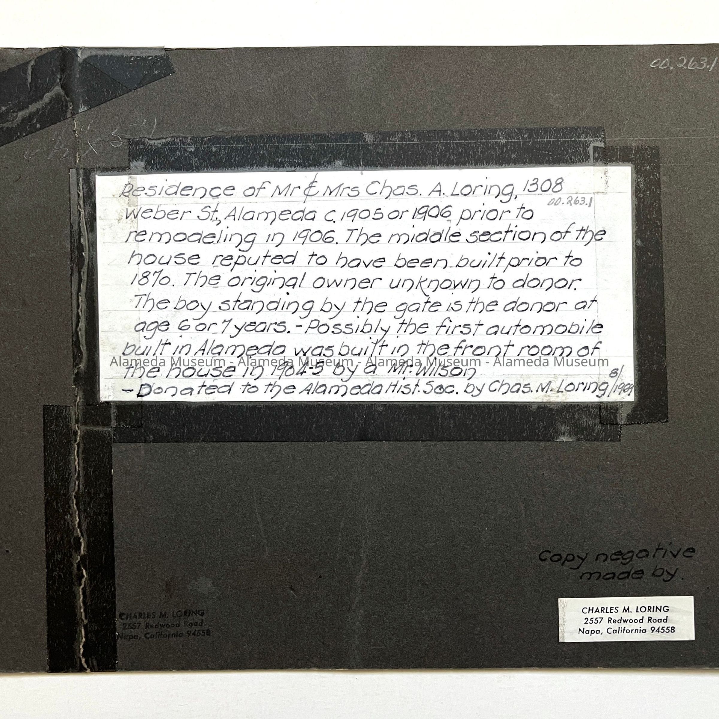 The photograph was given to the Alameda Historical Museum in 1969, assigned number 620 and never catalogued.
