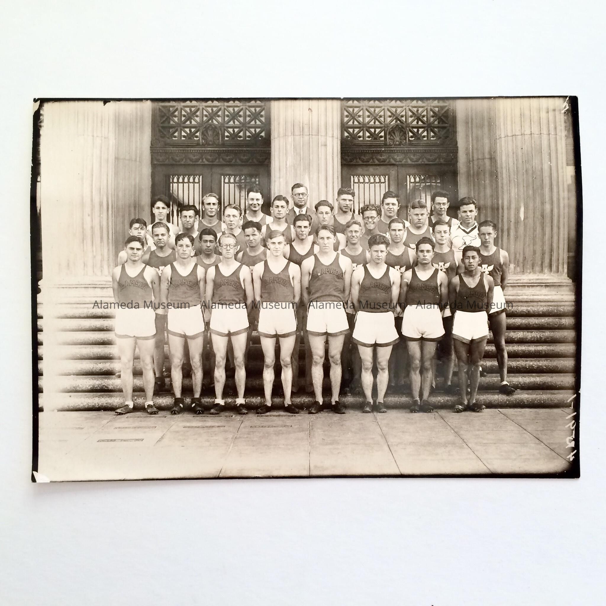 A PHOTO OF THE 1931 ALAMEDA HIGH SCHOOL TRACK TEAM MEMBERS (IN UNIFORMS), ACCOMPANIED BY THEIR COACH, LEWIS C JOLLEY. THEY ARE POSED AT THE FRONT ENTRANCE OF ALAMEDA HIGH SCHOOL.