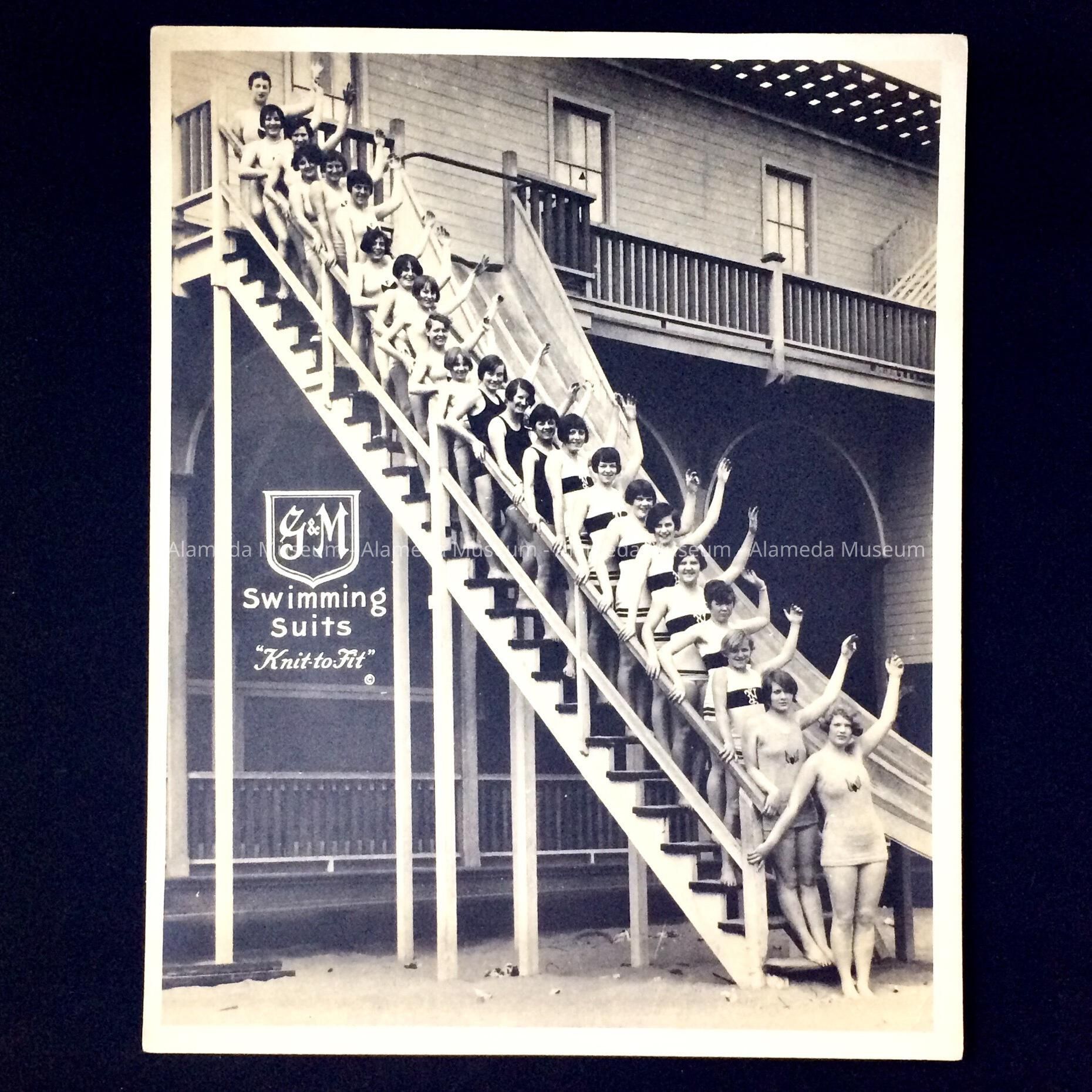Photo of 23 women posing on a staircase for a swimsuit ad, c. 1920sEntry/Object ID