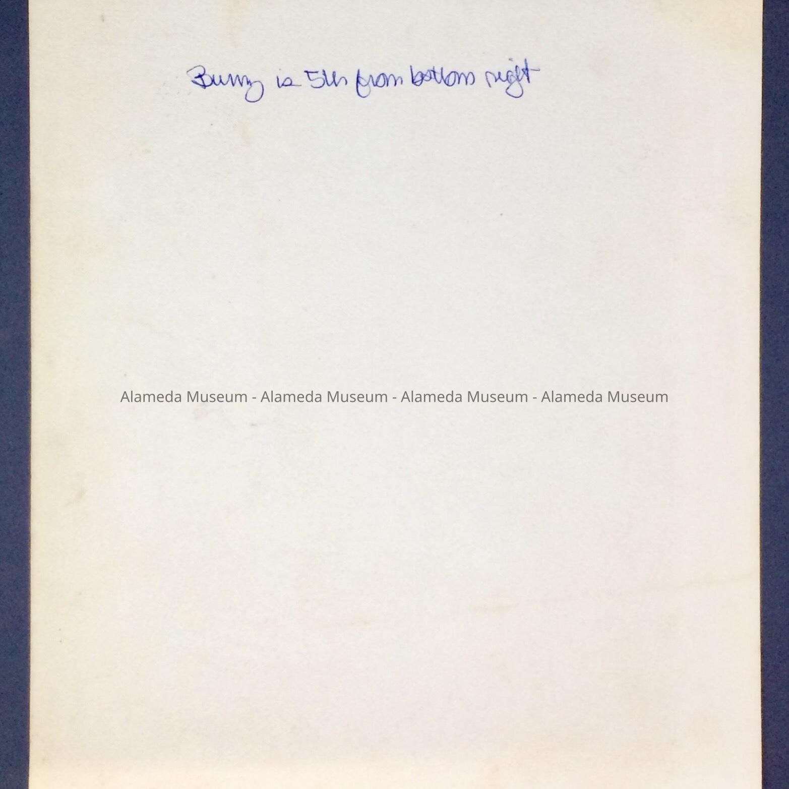 A PHOTO OF 23 YOUNG WOMEN WEARING ONE-PIECE BATHING SUITS, POSED ON A STAIRCASE. THE PHOTO ADVERTISES THE G & M CO. SWIMSUITS (AS A GIMMICK). BUNNY FERGUS IS FIFTH FROM THE BOTTOM RIGHT IN THE PHOTO.