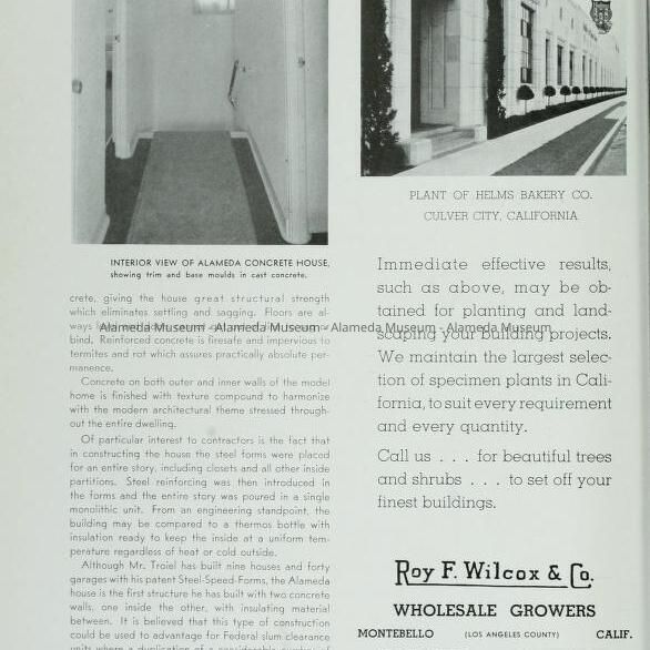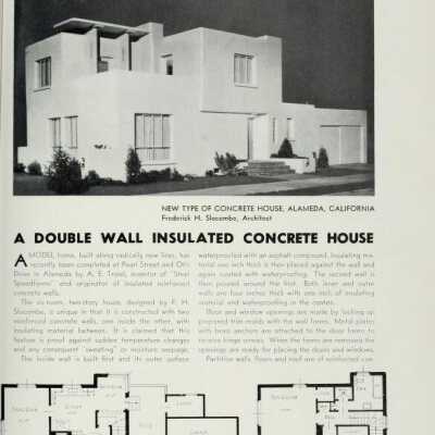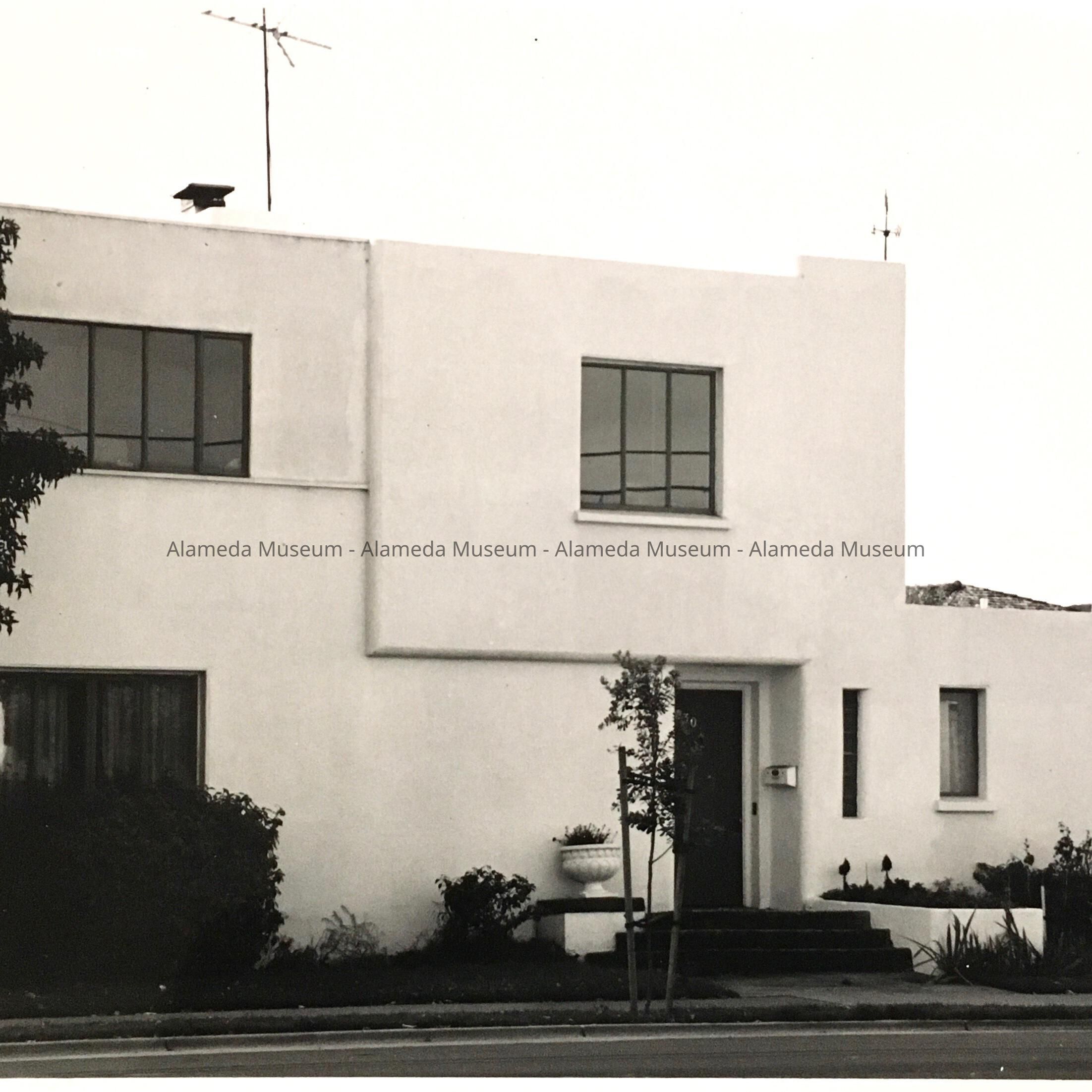 History of Object: Otis-side view of 2630 Otis Drive, shortly after construction, judging by the young tree along Otis Drive and other vegetation. Building permit issued 6 Dec. 1937, for 7,500, built 1938. Owner was Ruth Cornick, daughter of G.H. Noble, speculative builder in the area in the 1930s. Builder was Arthur E. Troiel, architect F.H. Slocombe of Oakland. Troiel invented a system of concrete construction which was used for the house. An article about the house appeared in the Nov. 1938 issue of Architect and Engineer. The house was last sold in 2017.