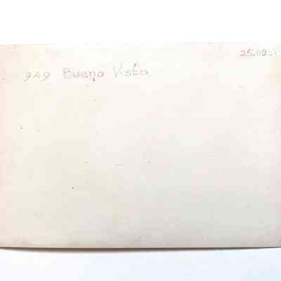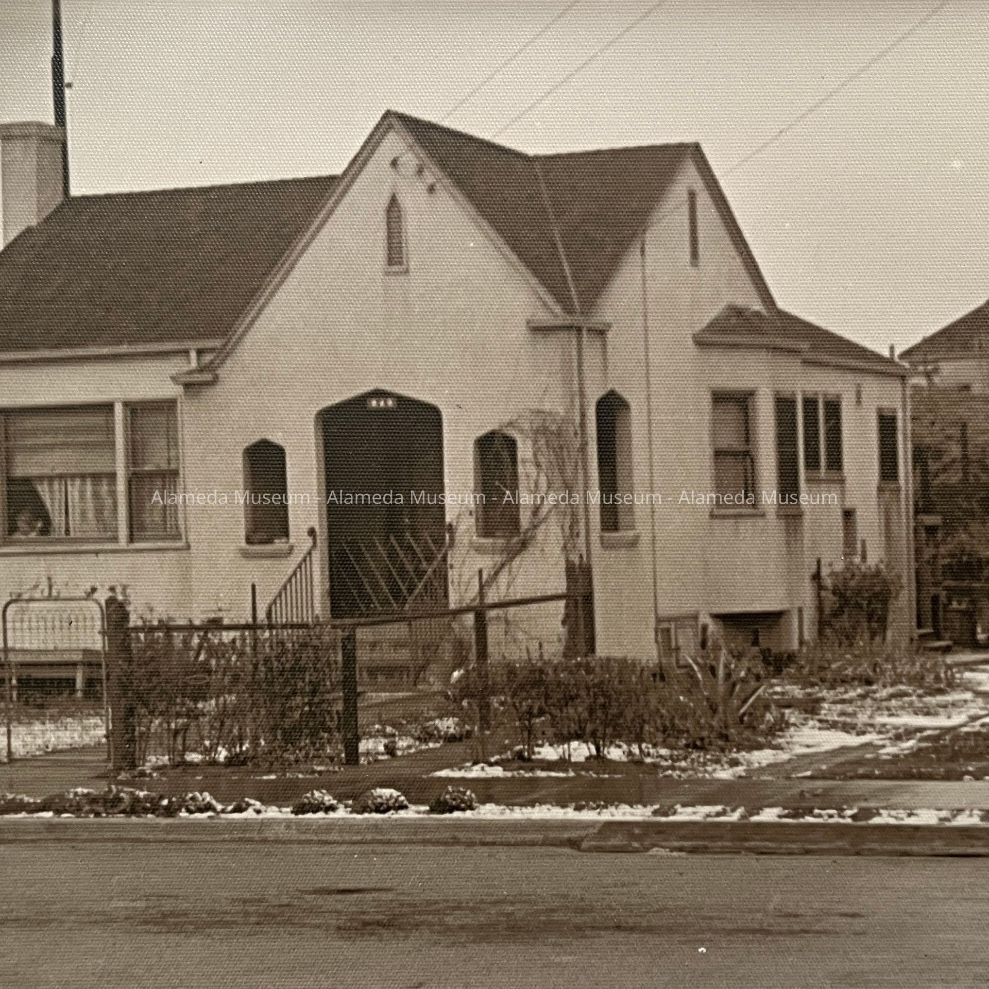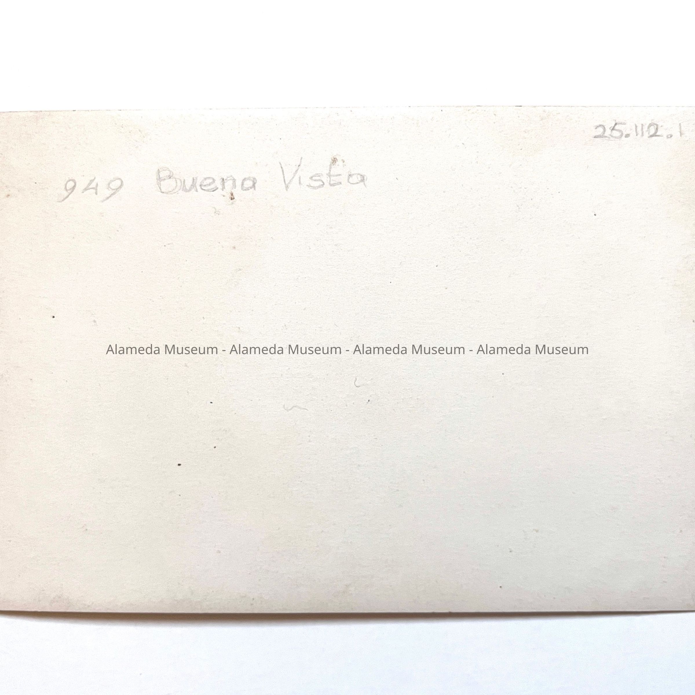 History of Object: photo encountered, unnumbered, in museum storage. House identified as 949 Buena Vista, in 1933 the home of amateur photographer Rodolpho or Rudolpho Dressel. Snow on the ground in Alameda is a rare occurrence, and based on that and the type of car in the garage, the photo can be dated to December 11, 1932, and the photographer may well have been Mr. Dressel. The taller building in the background no longer exists.