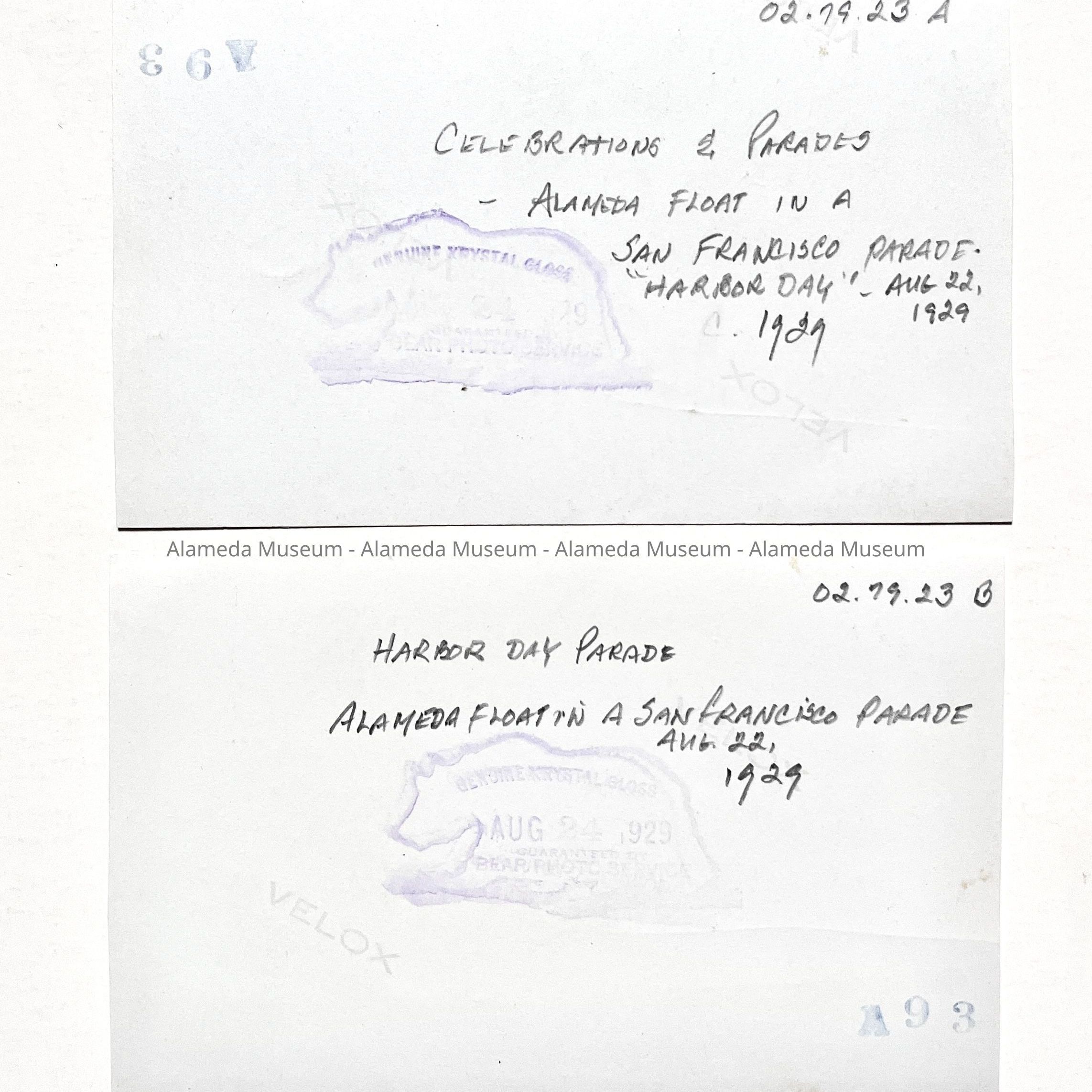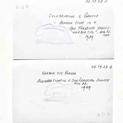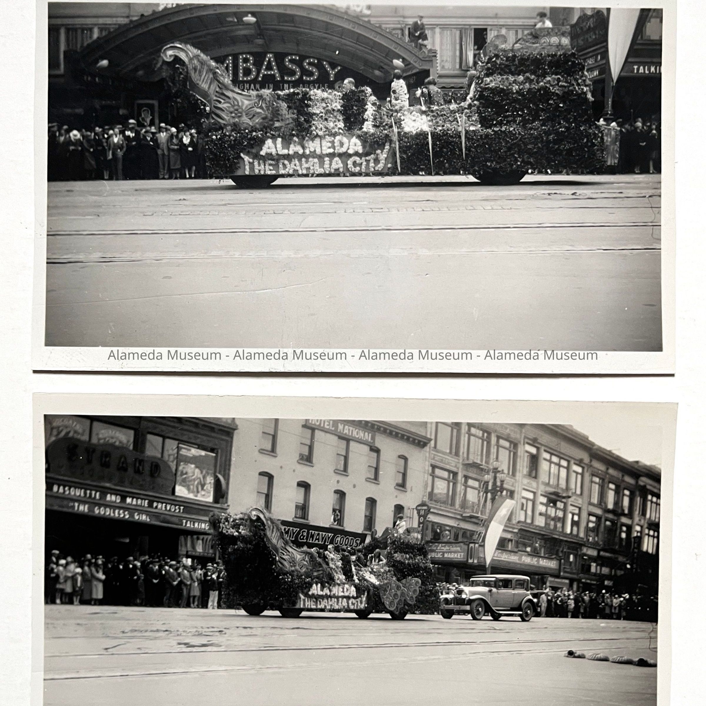 History of Object: Two views of an "Alameda - The Dahlia City" float in the San Francisco Harbor Day Parade, August 22, 1929.