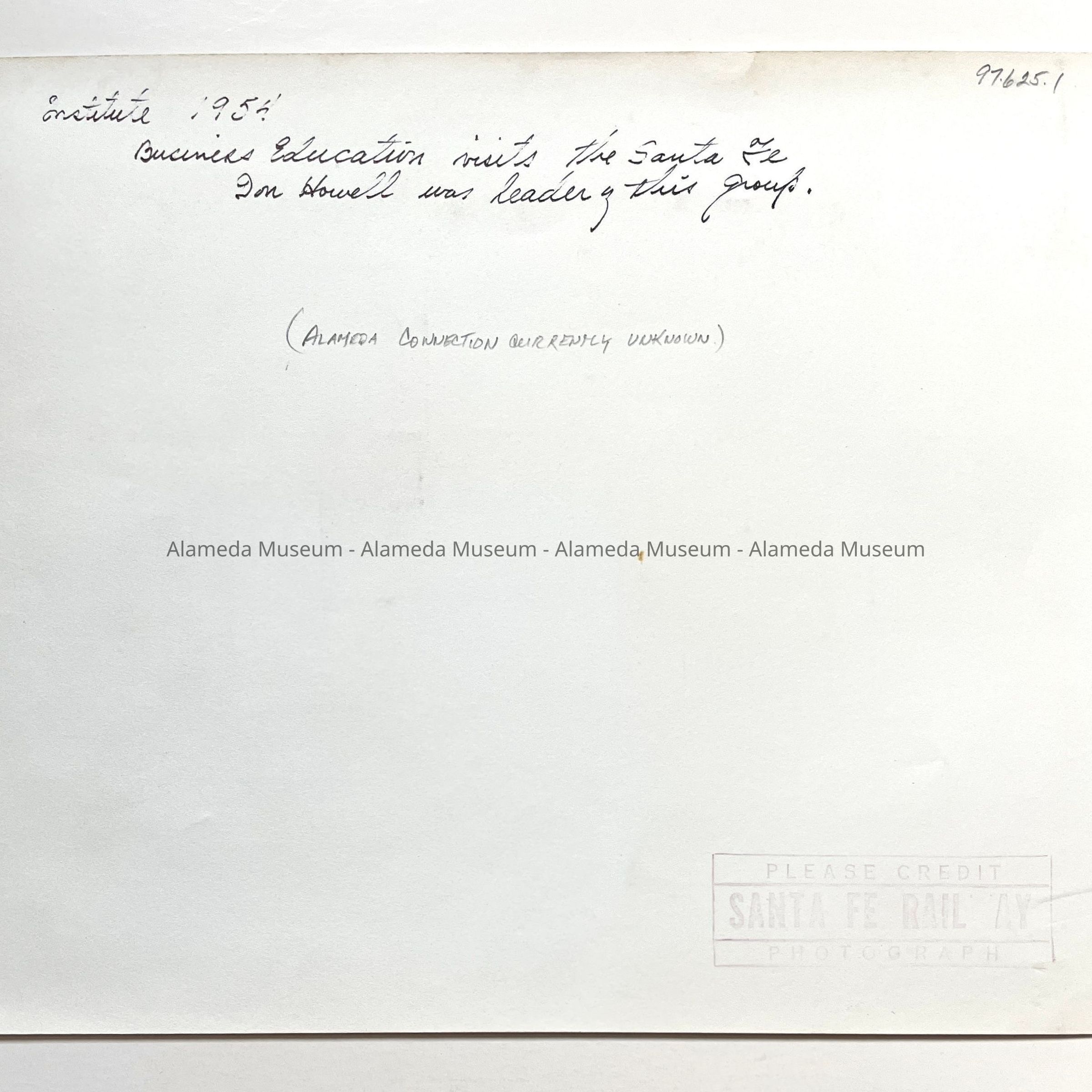 History of Object: Group of unidentified people, members of a "business education" body with their "leader Don Howell" visiting the Santa Fe railyard (in Oakland?). The Alameda connection with this event is unknown.