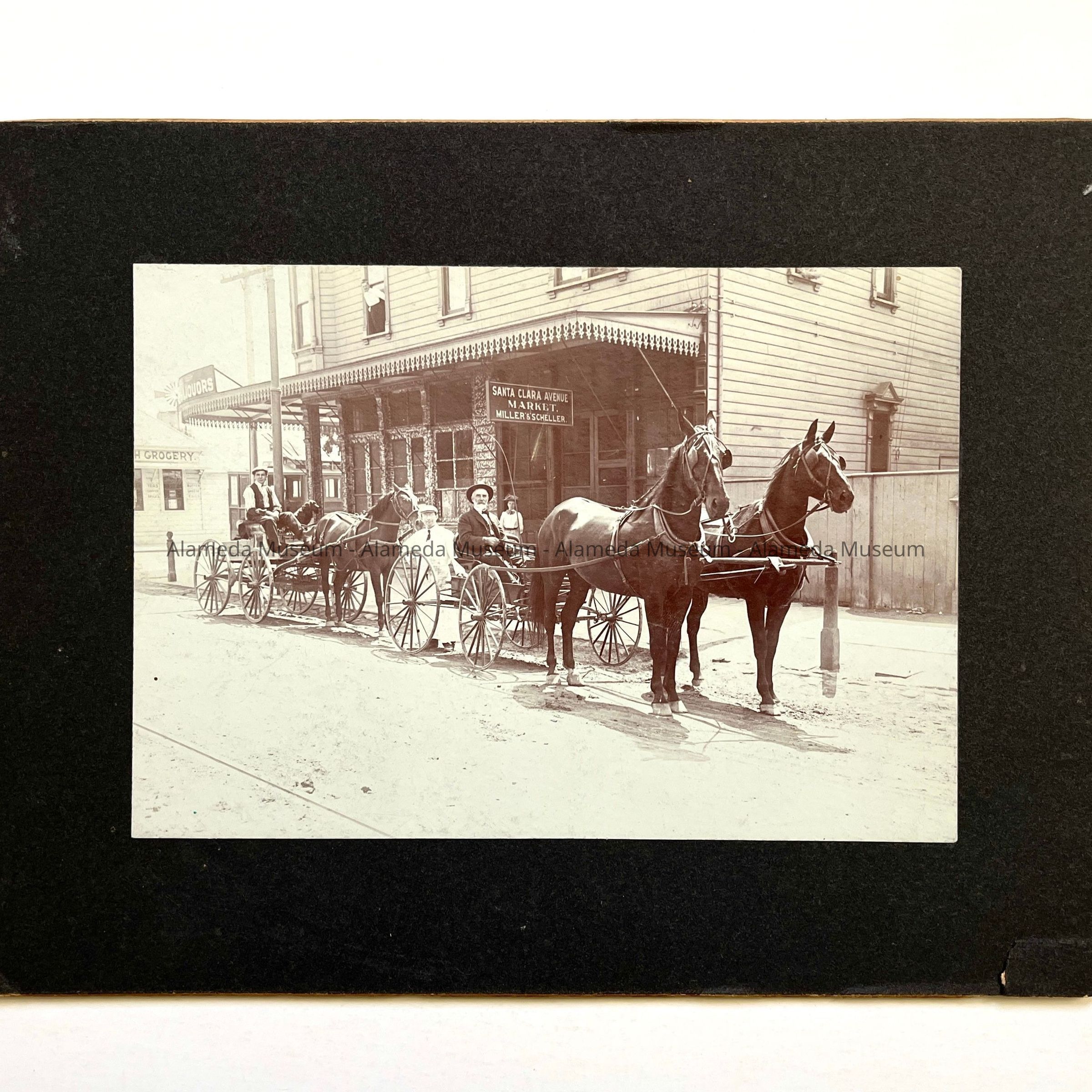 HISTORY OF OBJECT: A PHOTOGRAPH OF A PRIVATELY OWNED CARRIAGE AND DELIVERY WAGON PARKED IN FRONT OF THE SANTA CLARA AVENUE MARKET "MILLER & SCHELLER" PROPERTIES. LOCATED AT THE CORNER OF 9th STREET AND SANTA CLARA AVENUE, THE BUILDING PRESENTLY IS KNOWN AS 846 SANTA CLARA AVENUE, BUILT IN 1886.