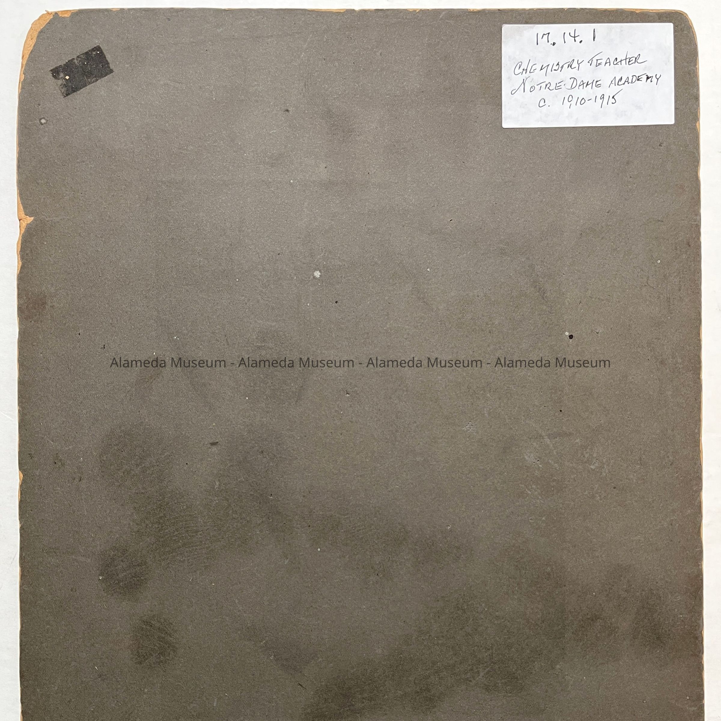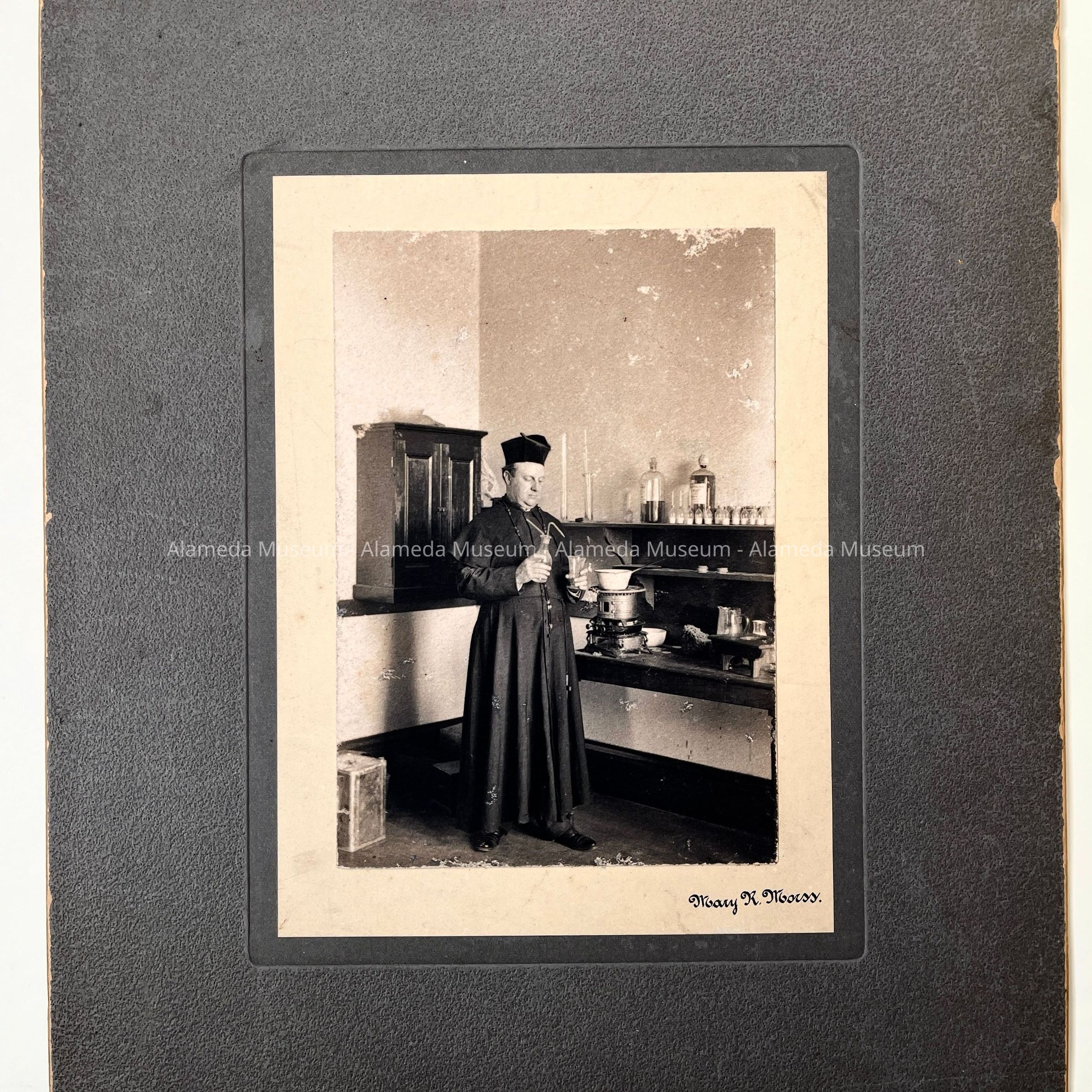 History of Object: The photograph portrays a Catholic priest, wearing a cassock and biretta holding what appears to be chemistry bottles, standing next to shelving with a variety of bottles and other laboratory artifacts. It is probable that he taught chemistry at Notre Dame Academy in Alameda, a parochial high school. This image was purchased by the donor in 1992 at an Alameda flea market.