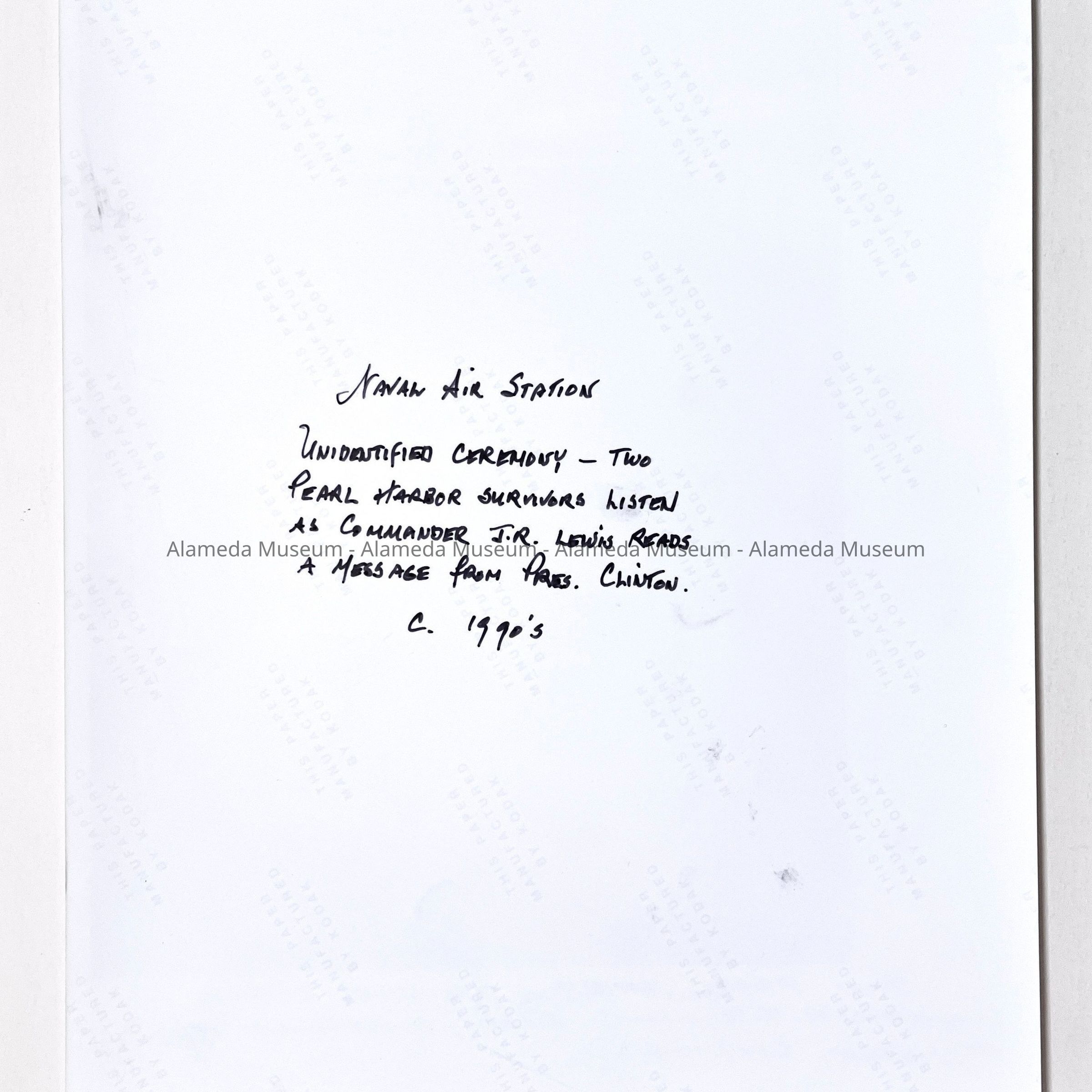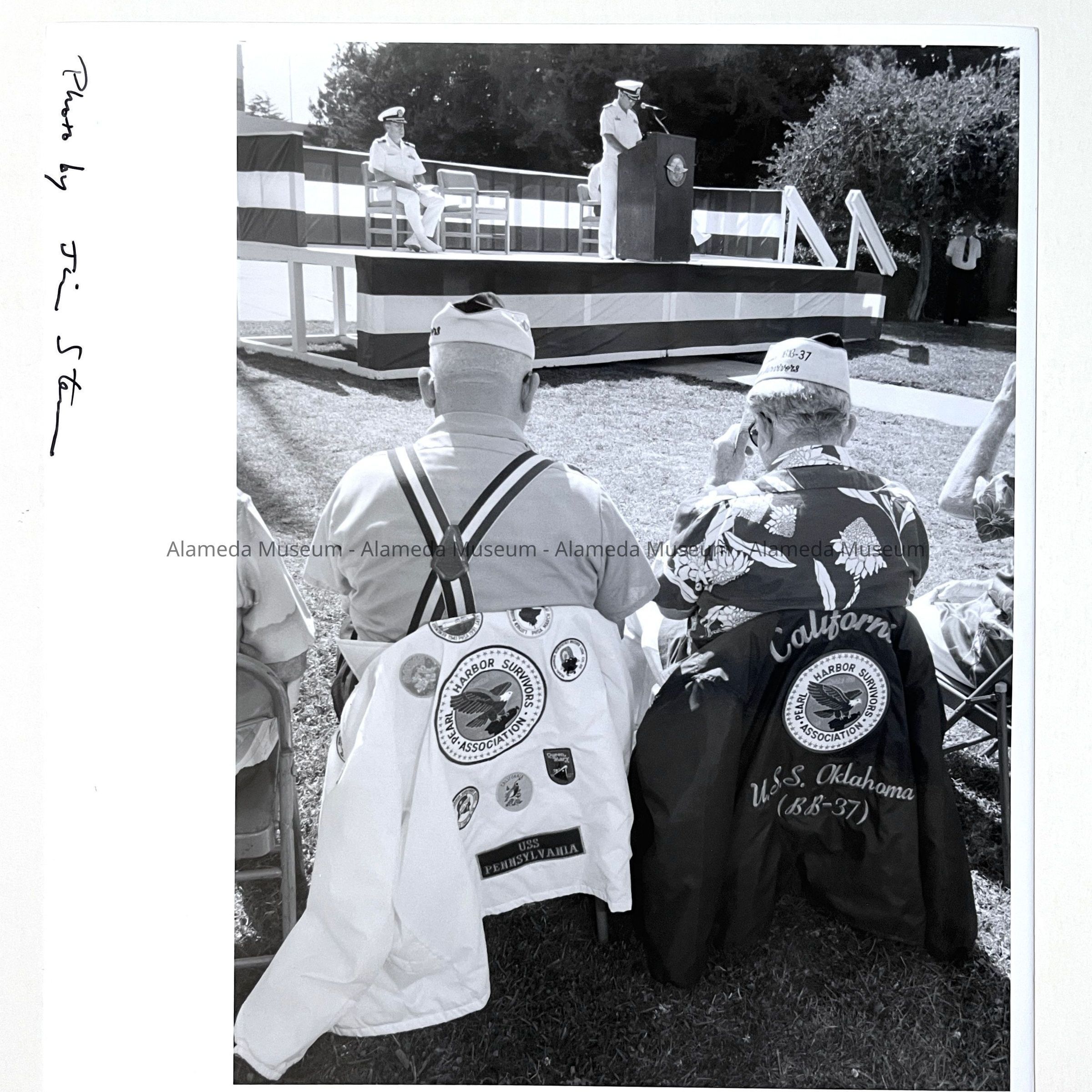 History of Object: Two Pearl Harbor Survivors listen as the N.A.S. Commanderb J. R. Lewis reads a message from President Clinton at an unidentified ceremony.