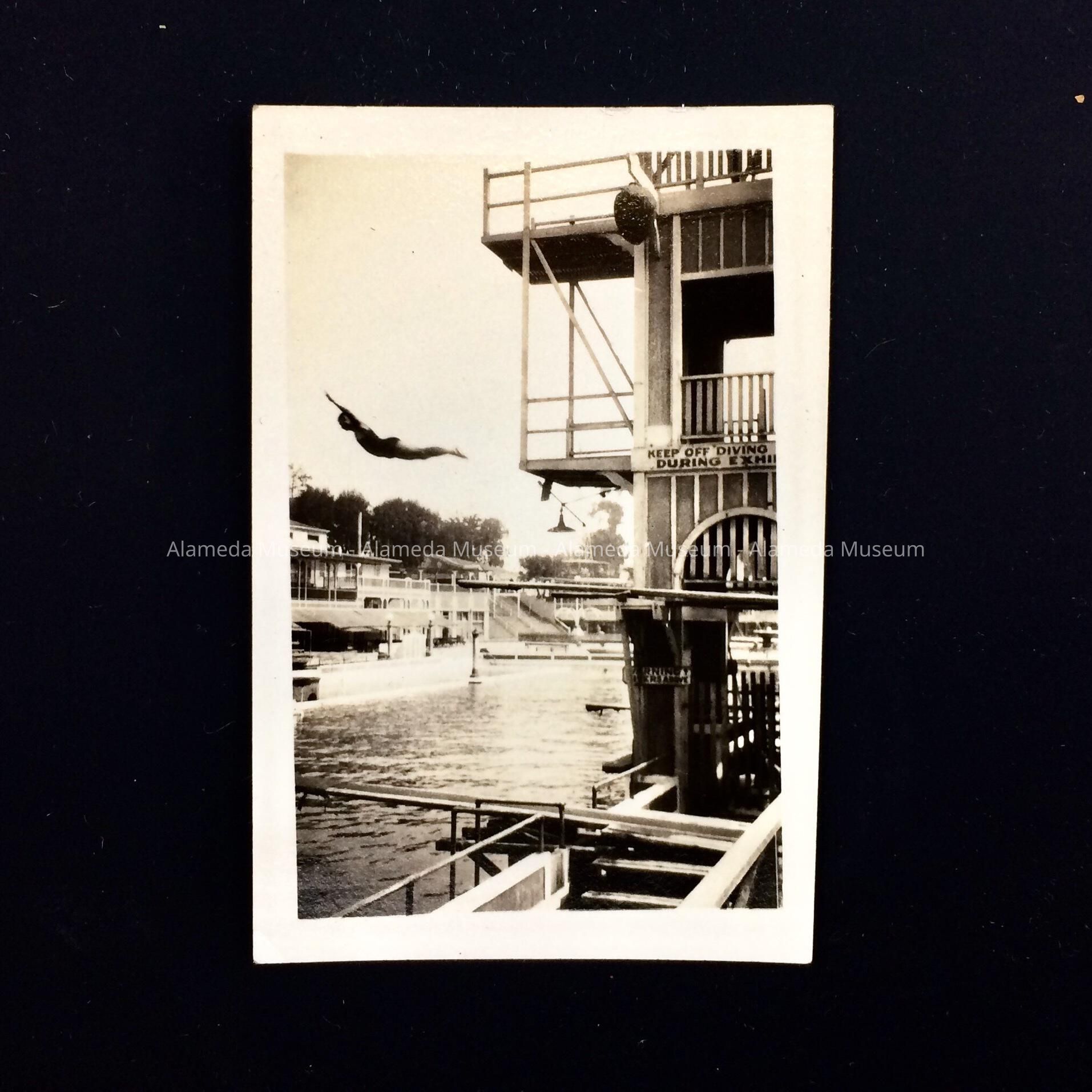 A PHOTOGRAPH SHOWING A DIVER JUMPING FROM THE HIGH DIVING BOARD AT NEPTUNE BEACH, ALAMEDA.