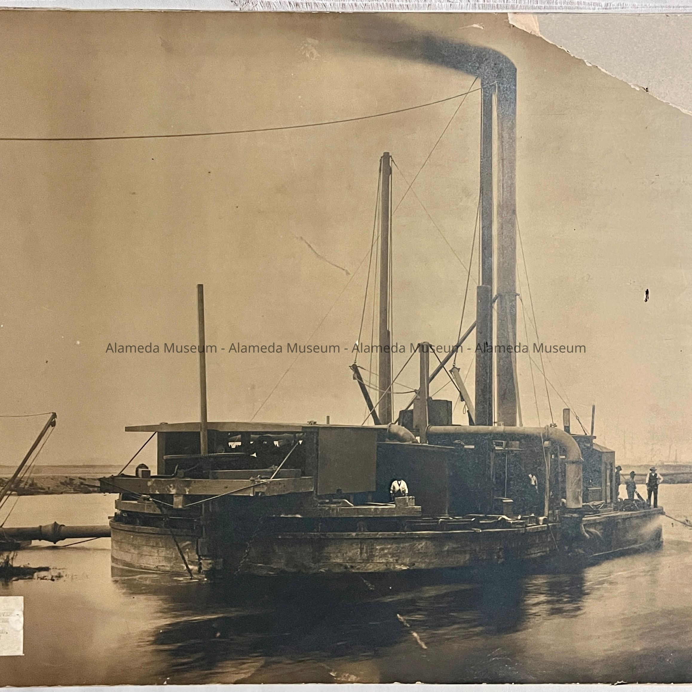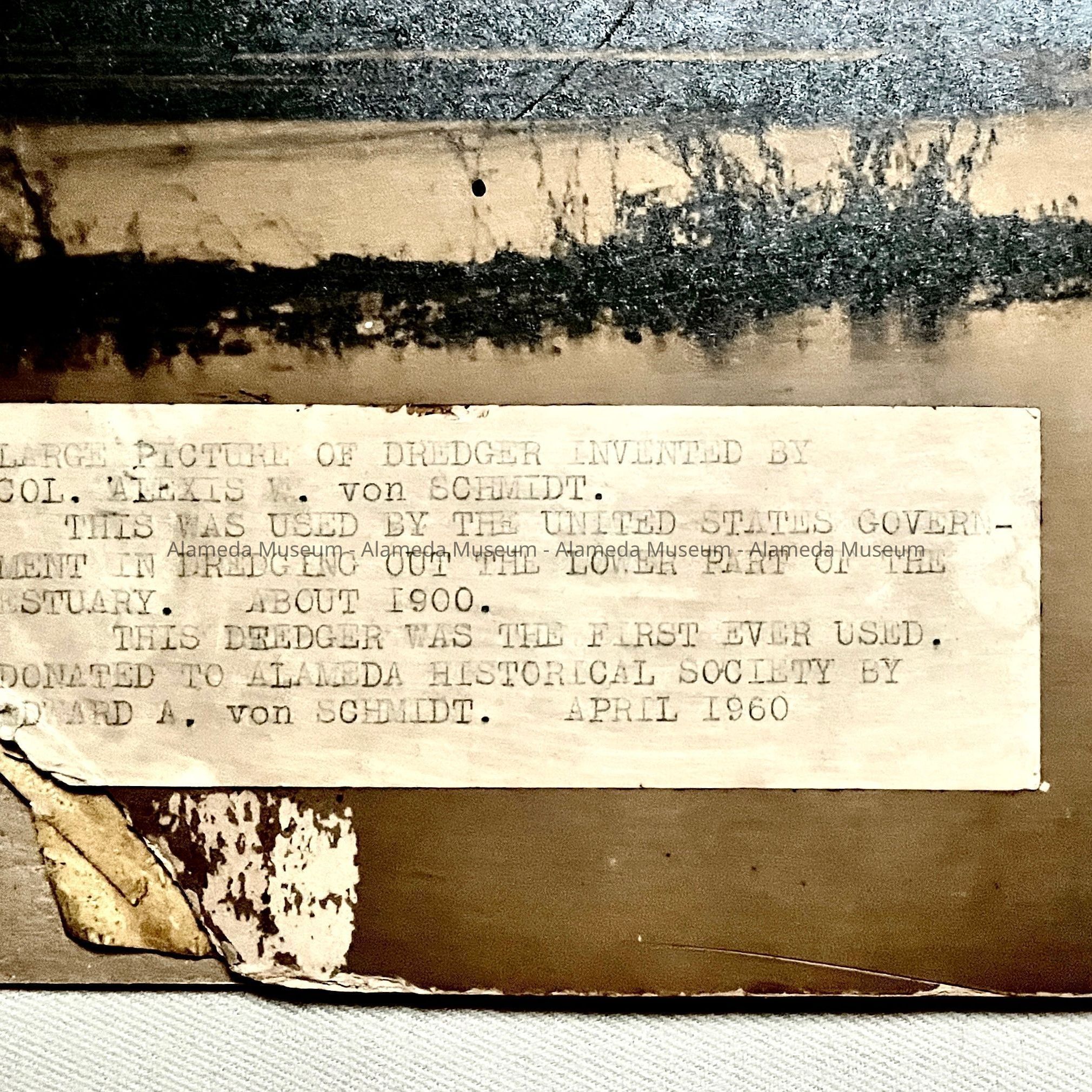 PHOTOGRAPH OF A DREDGER INVENTED BY COLONEL ALEXIS W VON SCHMIDT. IT WAS USED BY THE U S GOVERNMENT IN DREDGING OUT THE LOWER PART OF THE OAKLAND-ALAMEDA ESTUARY. PHOTOGRAPH IS PART OF THE ORIGINAL ALAMEDA HISTORICAL SOCIETY COLLECTION AND DONATED IN APRIL 1960.