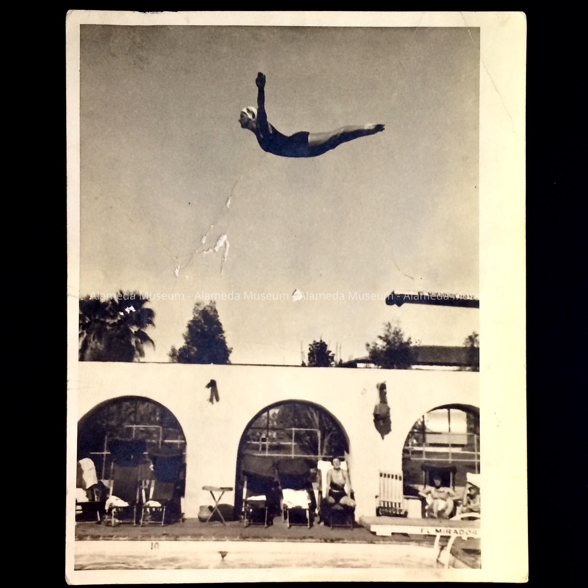 Photo of a female diver diving into El Mirador Hotel, c. 1930sEntry/Object ID
