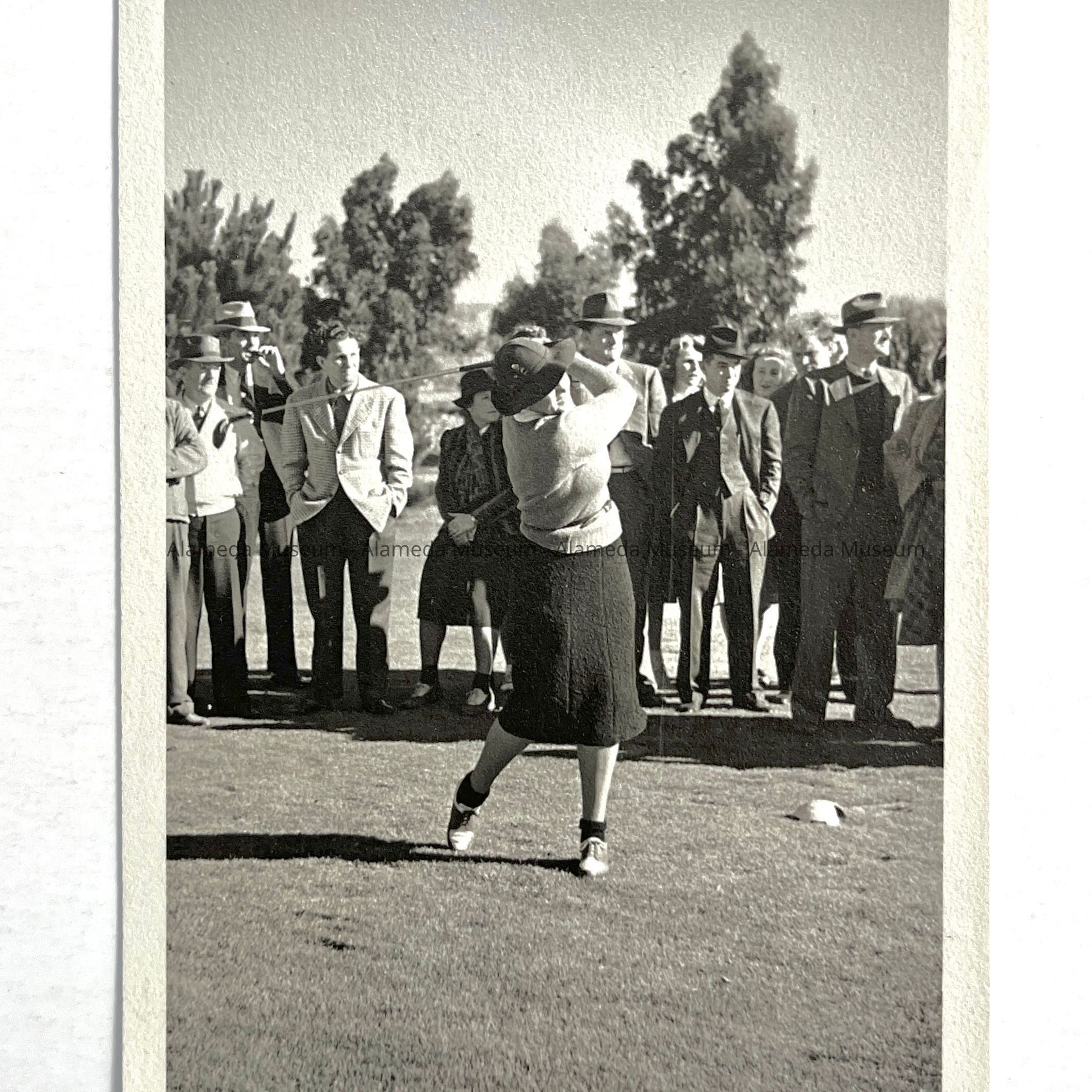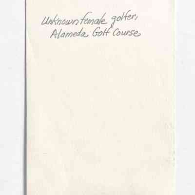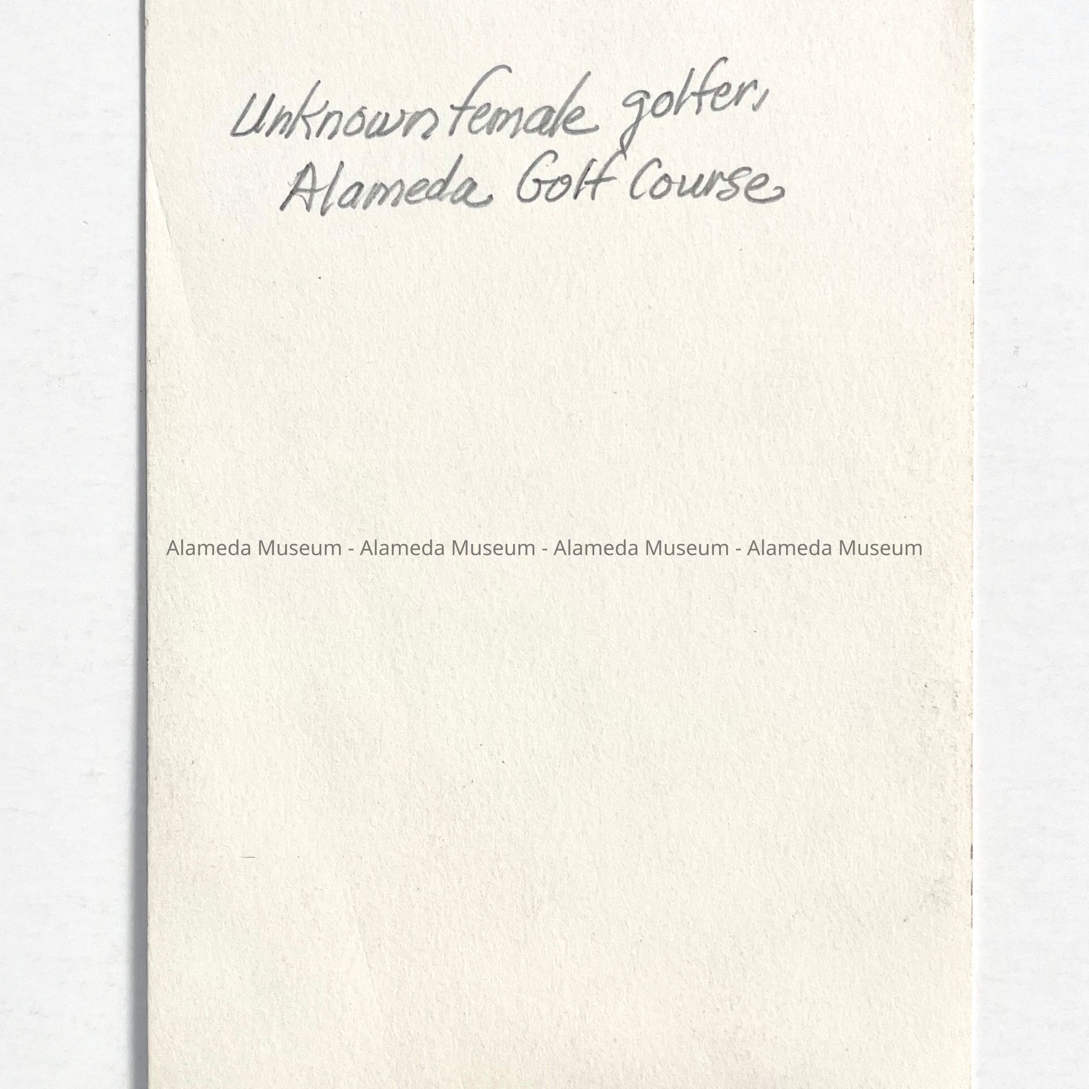 A PHOTOGRAPH OF AN UNIDENTIFIED FEMALE GOLFER AT THE ALAMEDA MUNICIPAL GOLF COURSE.