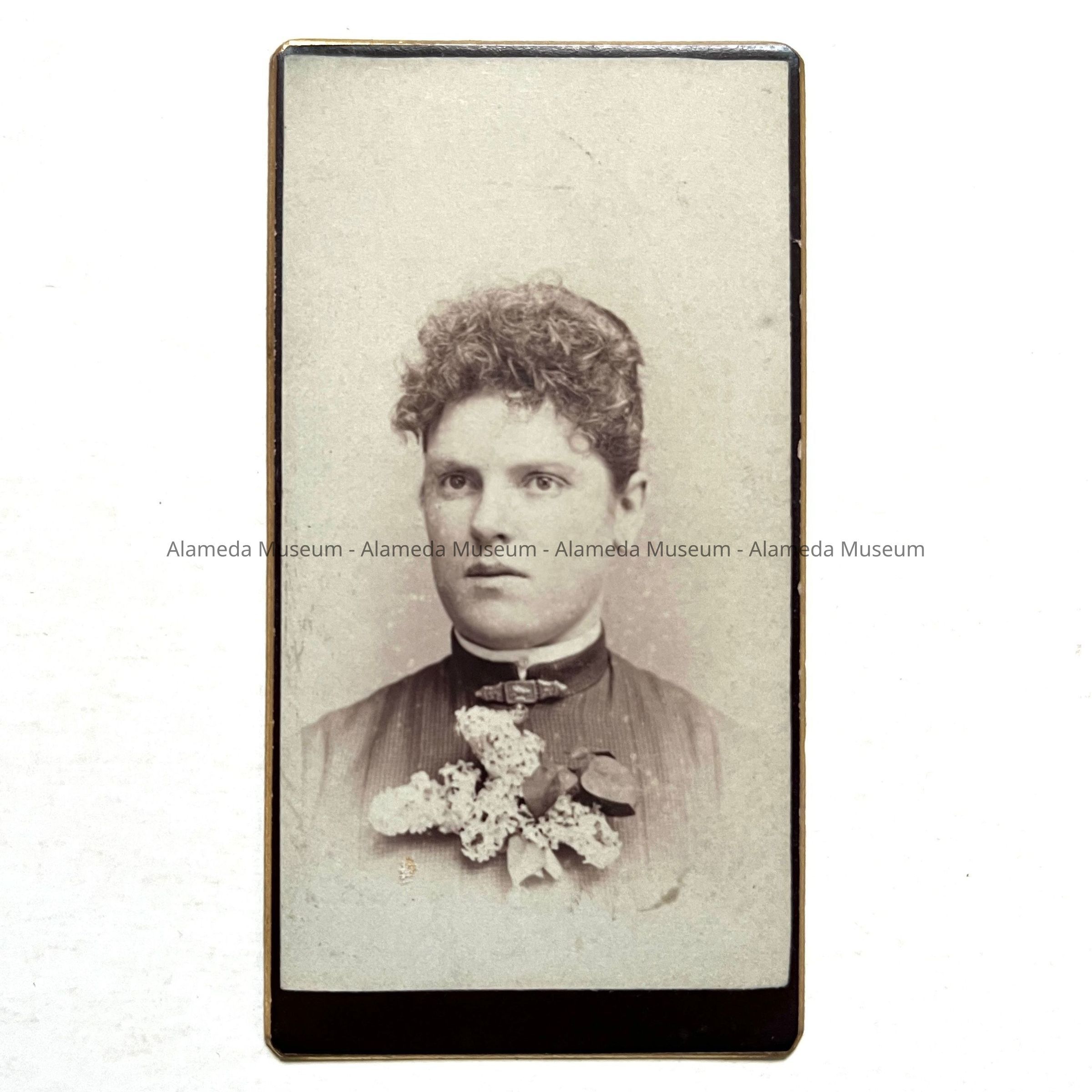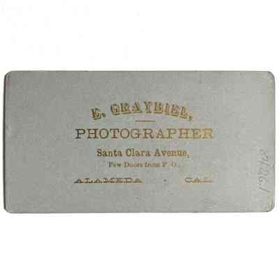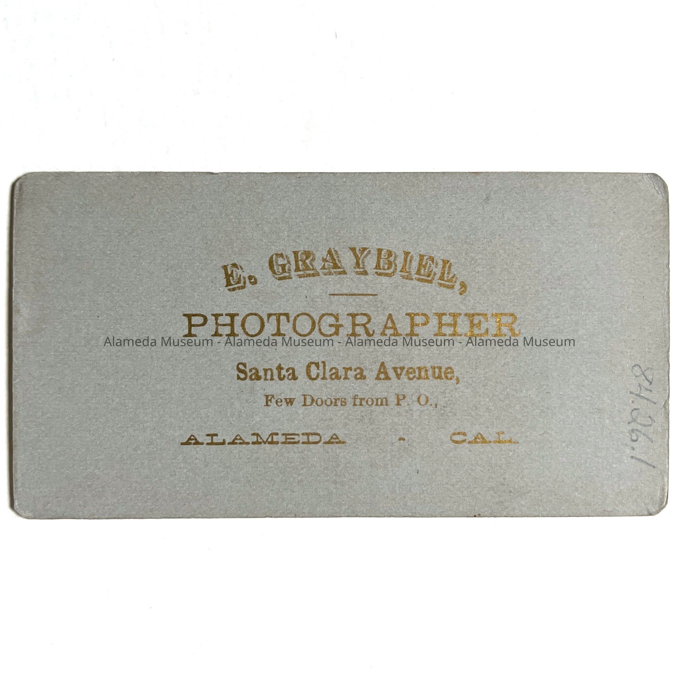 Description: Sepia tinted photo on professional mounting. On the reverse side in gold type "E. Graybiel, Photographer, Santa Clara Avenue, Few Doors for P.0., Alameda, Cal." has been printed.