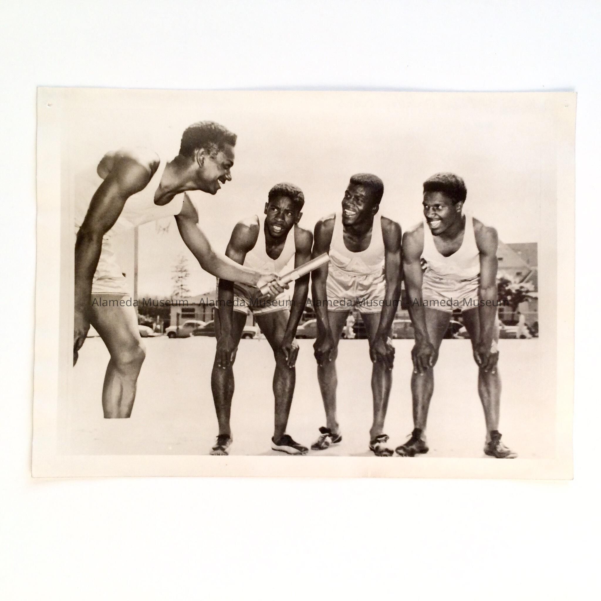 A PHOTO OF A GROUP OF AFRICAN-AMERICAN TRACK RUNNERS WEARING ALAMEDA HIGH SCHOOL OFFICIAL TRACK TEAM UNIFORMS.