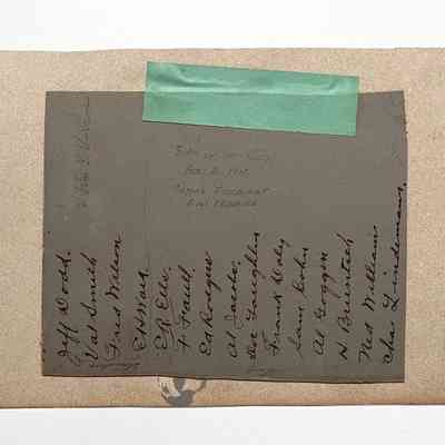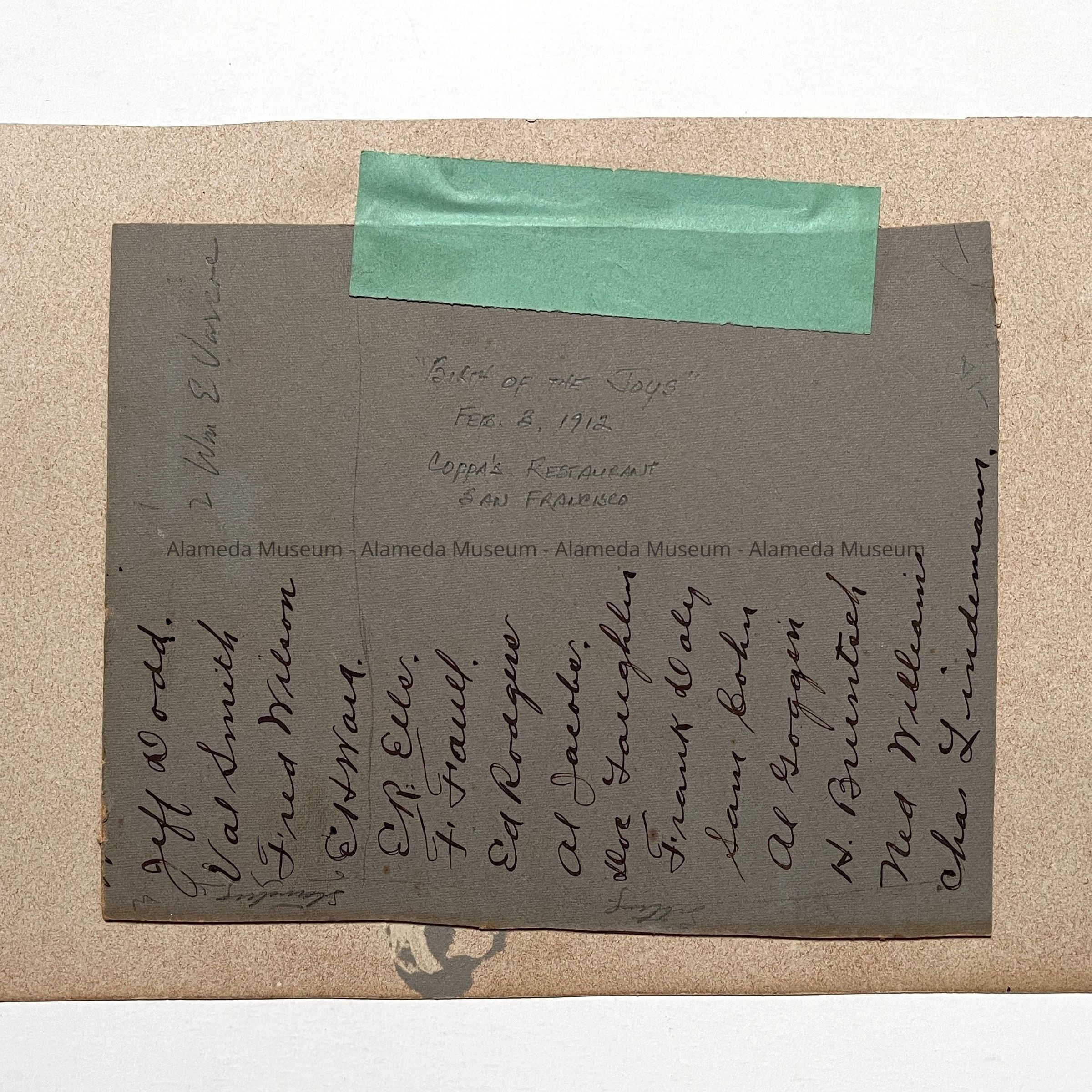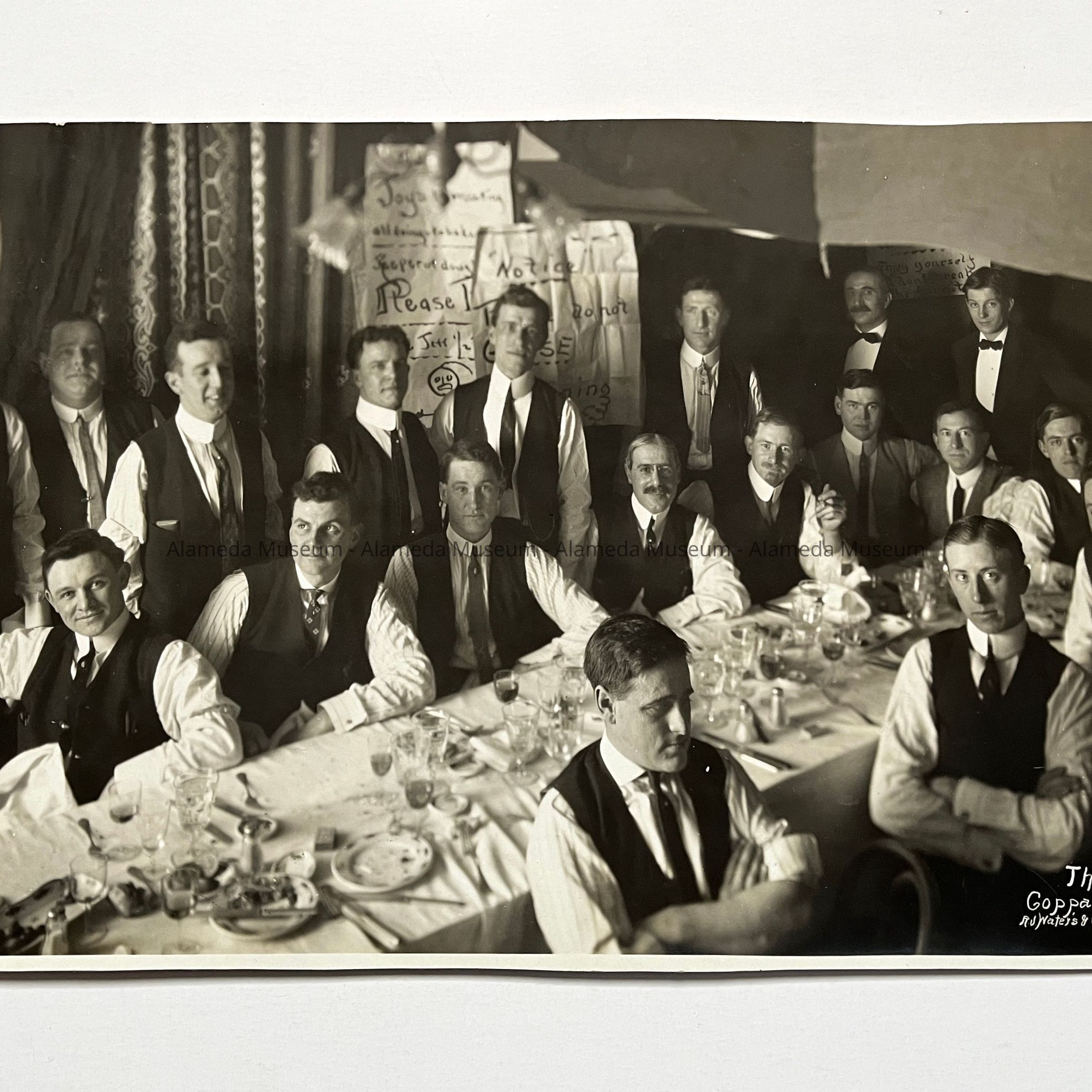 History of Object: Portrait of a group of young men, all dressed in white shirts, dark neckties and vests, seated at a banquet table at Coppa's Restaurant, San Francisco. Printed into the negative is: "The Birth of the Joys, Feb. 3, 1912", plus the photographer's name and address. Some participants are identified on a card attached to the verso.