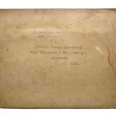 Description: Sepia-toned albumen print photograph, mounted on tan paperboard. Photographer: Pacific Scenic Company, Corner Chestnut and Railroad (now Lincoln) Avenue, Alameda. Damage to image includes soiling, spotting, staining; there is also a segment of the image (abt. 1-in in diam.) torn off the lower right corner.