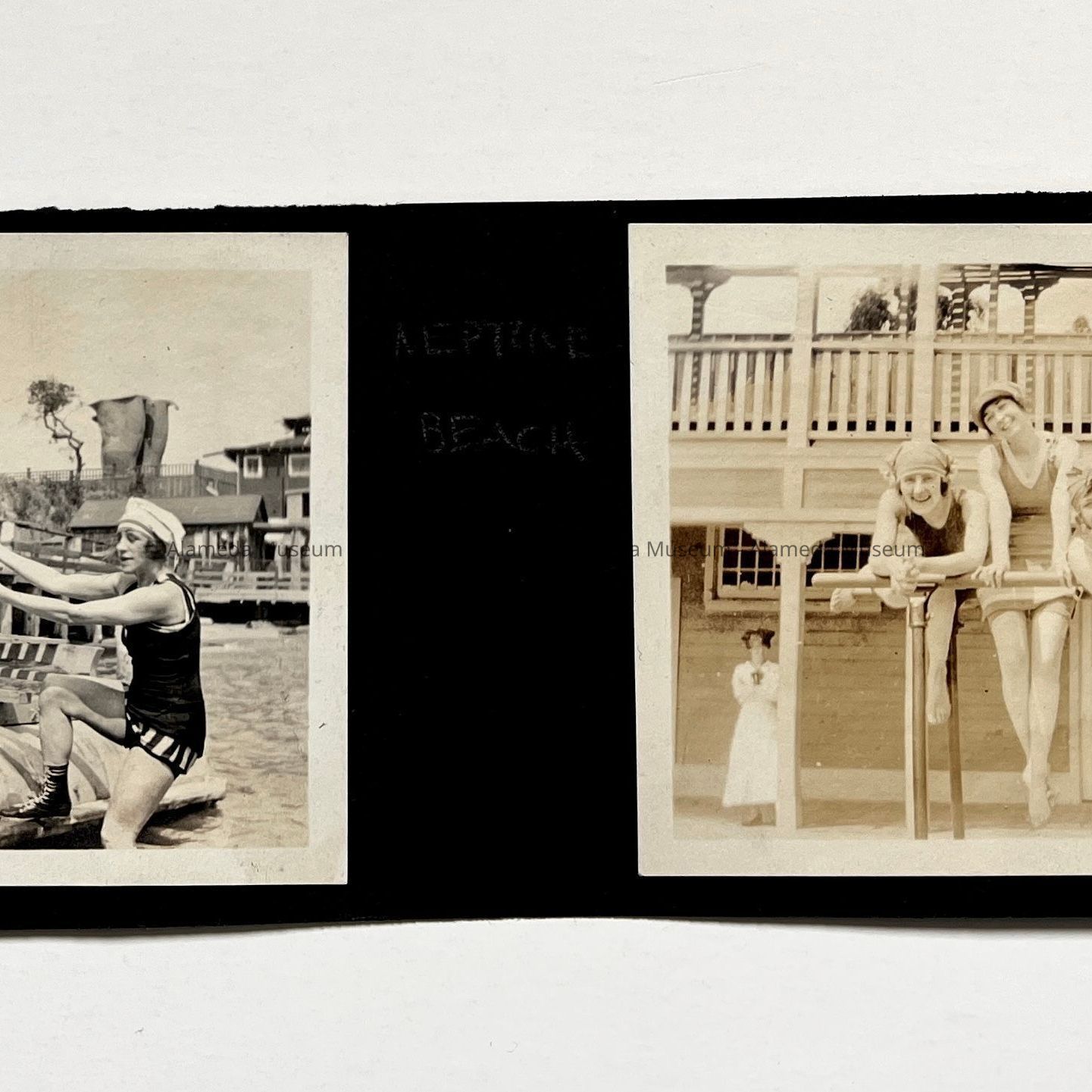 HISTORY OF OBJECTS: A GROUP PHOTOGRAPH OF WOMEN AND ONE GENTLEMAN POSING AT ALAMEDA'S NEPTUNE BEACH. THE MAN IS WEARING THE OFFICIAL NEPTUNE BEACH BATHING SUIT WITH THE LOGO, "NEPTUNE BEACH," ON THE FRONT.