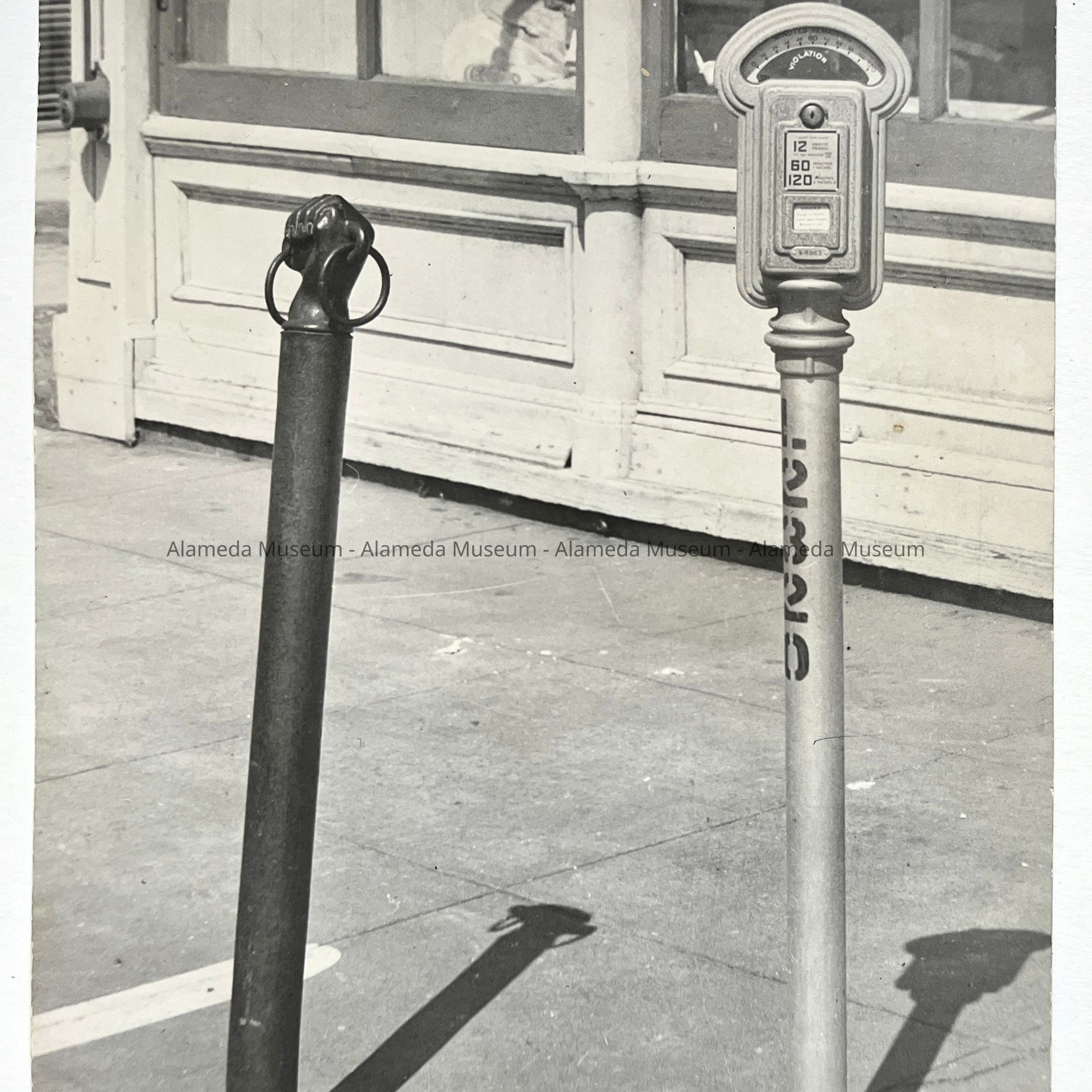 Photo of a hitching post and parking meter, Park Street and Lincoln, c. 1950Entry/Object ID