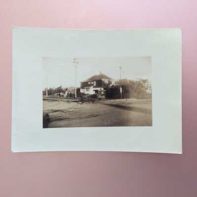 Description: a sepia photo with 3/4" margin, of a street corner, with what appear to be unpaved streets, telegraph poles and railroad tracks making a corner, and on the street turn, a horse and cart, which advertises 'Fuller Brushes'.
