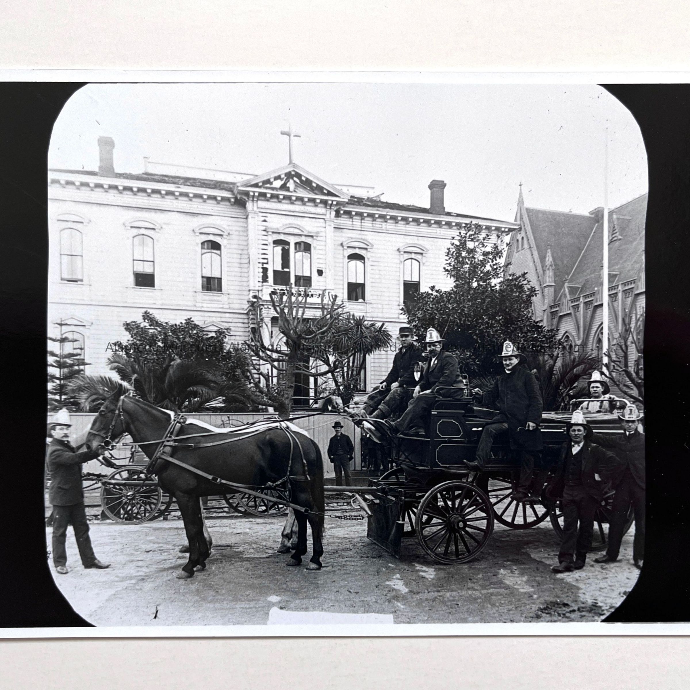 History of Object: Horse-drawn fire truck with the fireman, posed in front of Notre Dame Academy after having extinguished a fire therein.