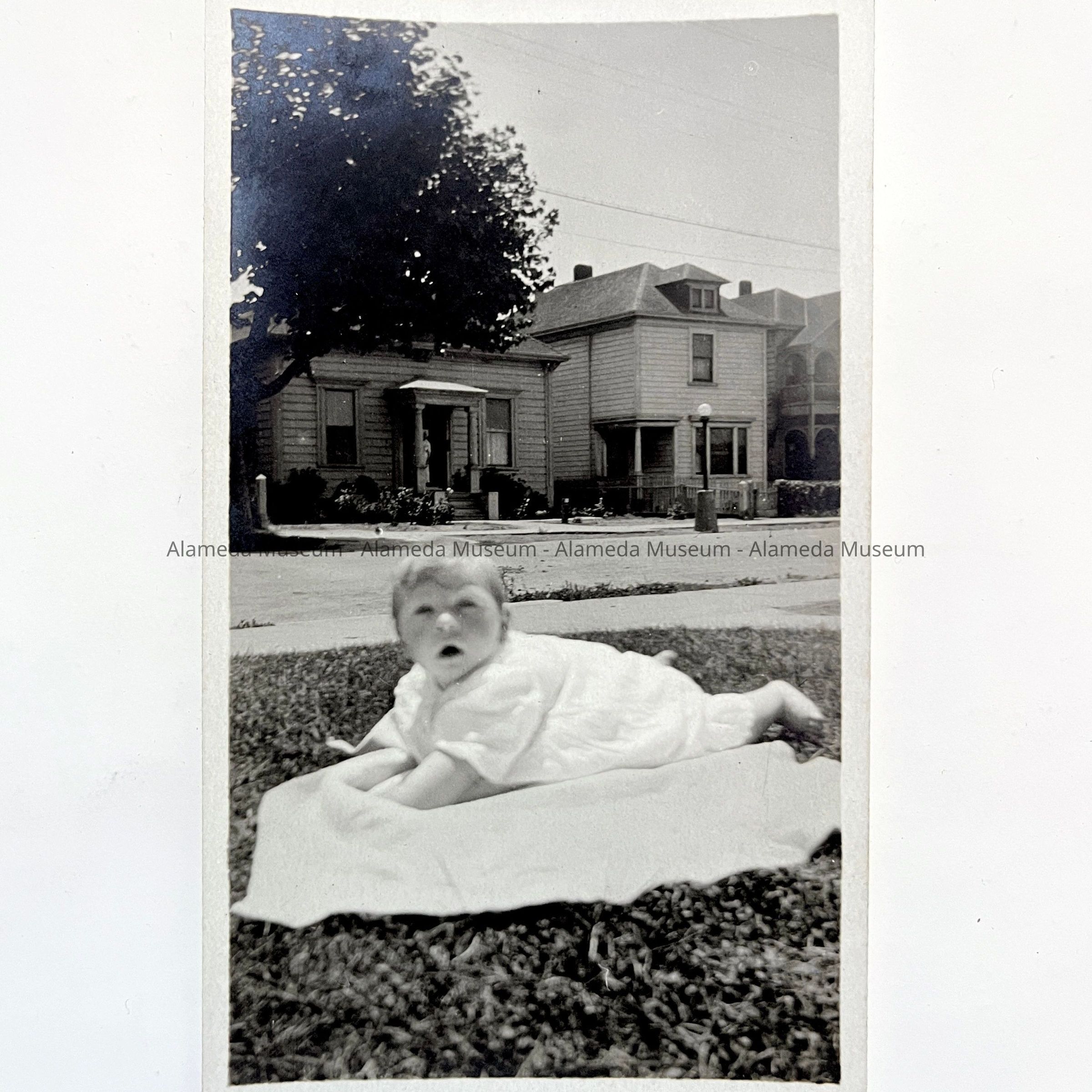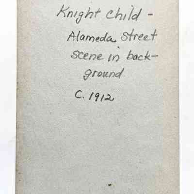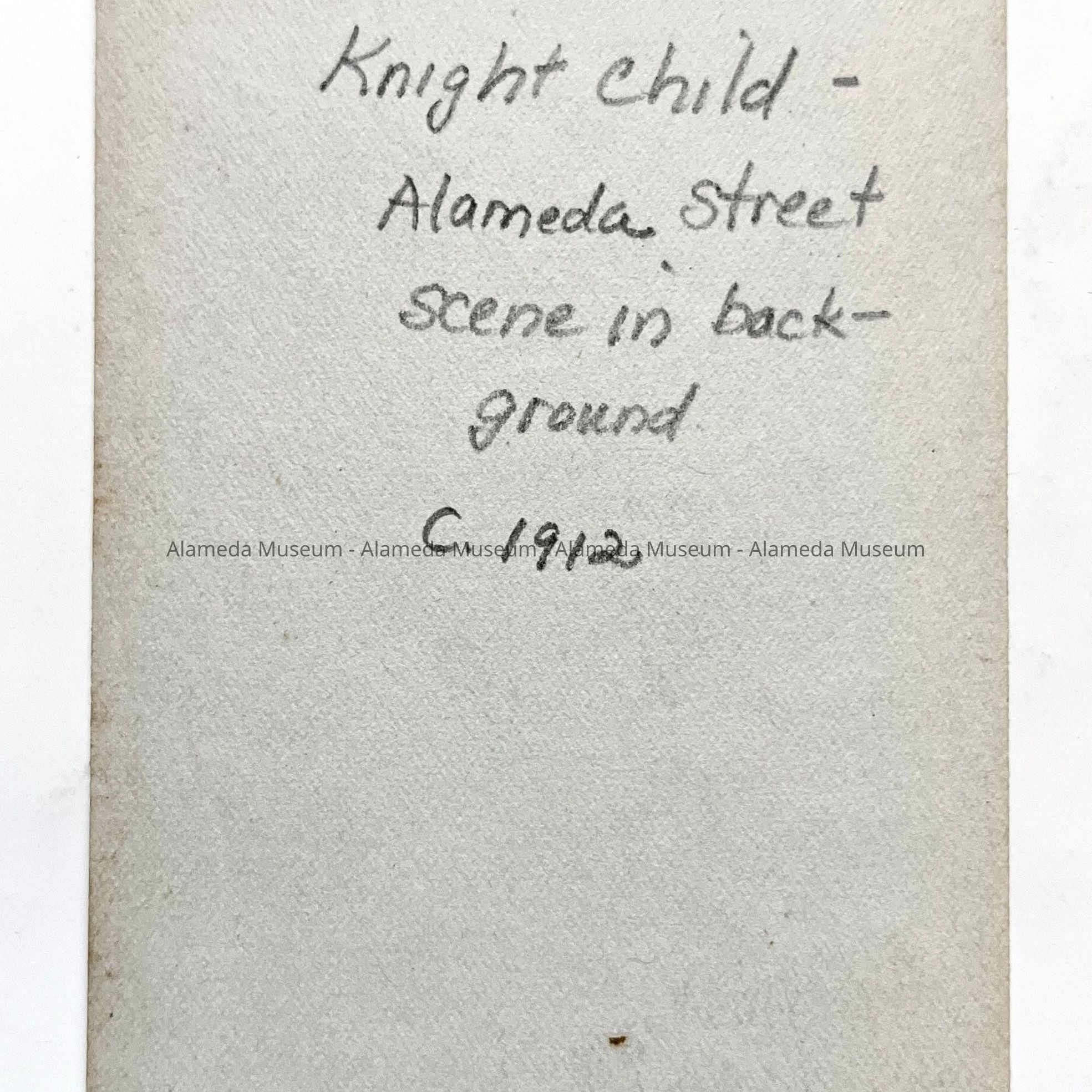 PHOTOGRAPH OF ONE OF THE G B KNIGHT CHILDREN. IN THE BACKGROUND IS AN ALAMEDA STREET SCENE, CIRCA 1912. PICTURED IS THE ELECTROLIER STANDARD OF THE PERIOD. THE HOUSES ARE NOT IDENTIFIED.