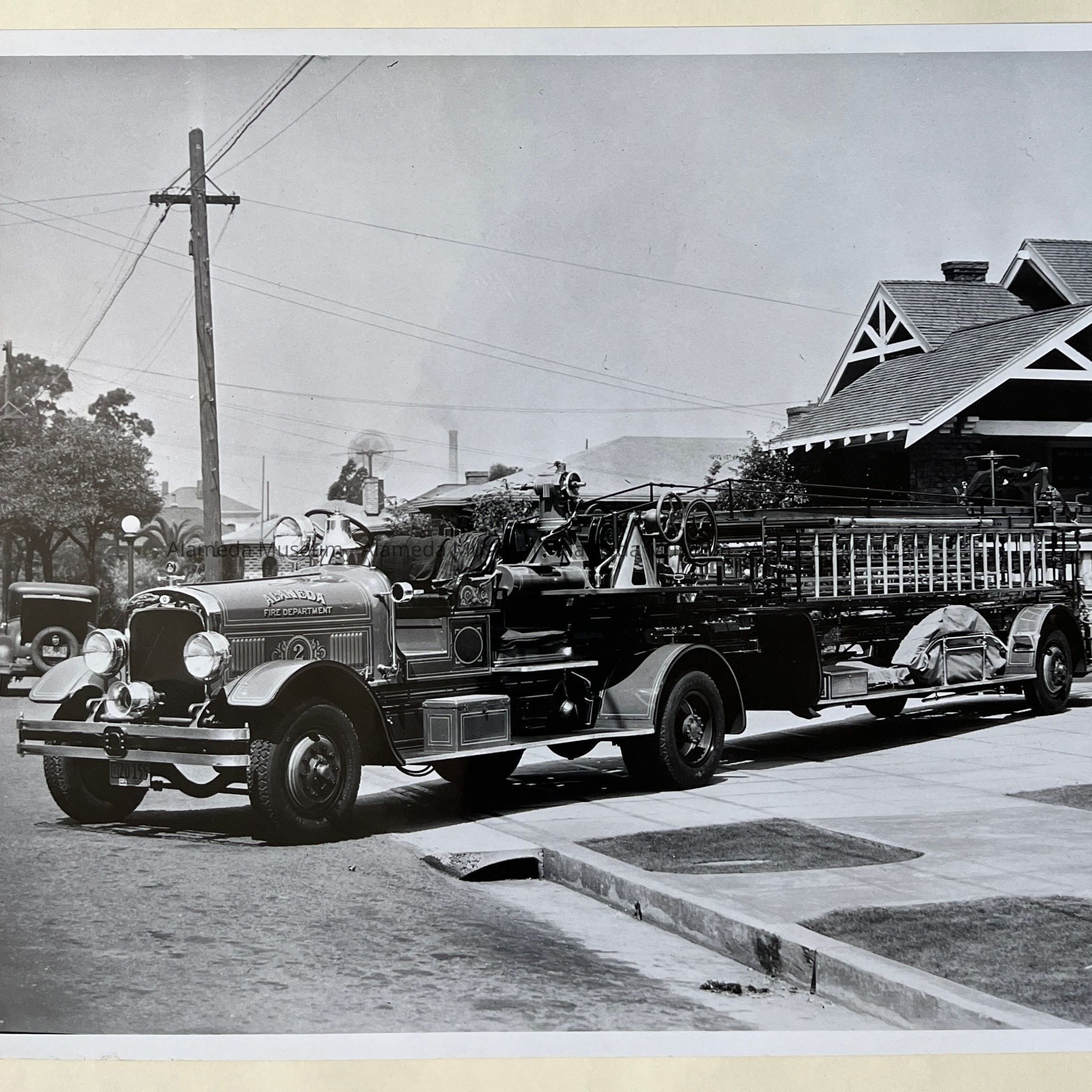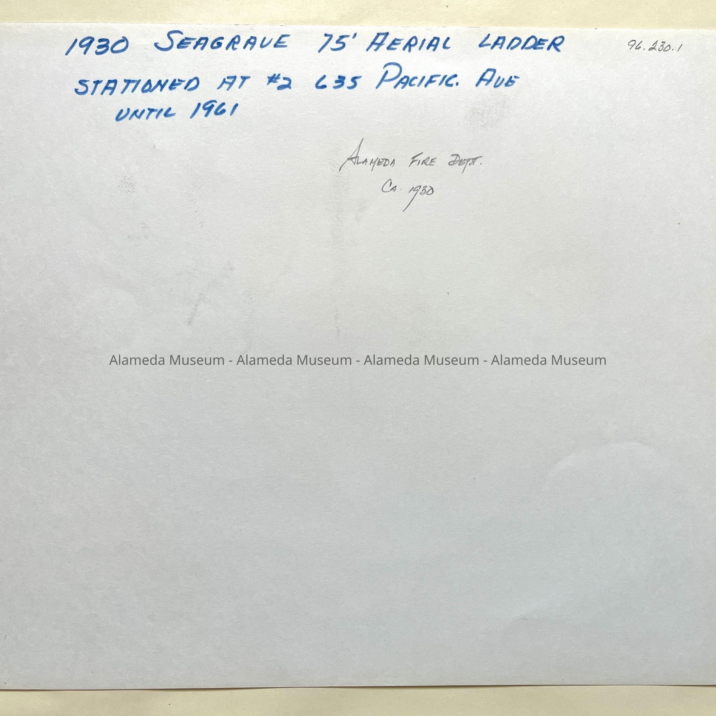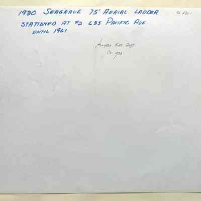 History of Object: View of a 1930 Seagrave 75' aerial ladder firetruck, stationed at Fire House #2 (at 635 Pacific Avenue) until 1961.