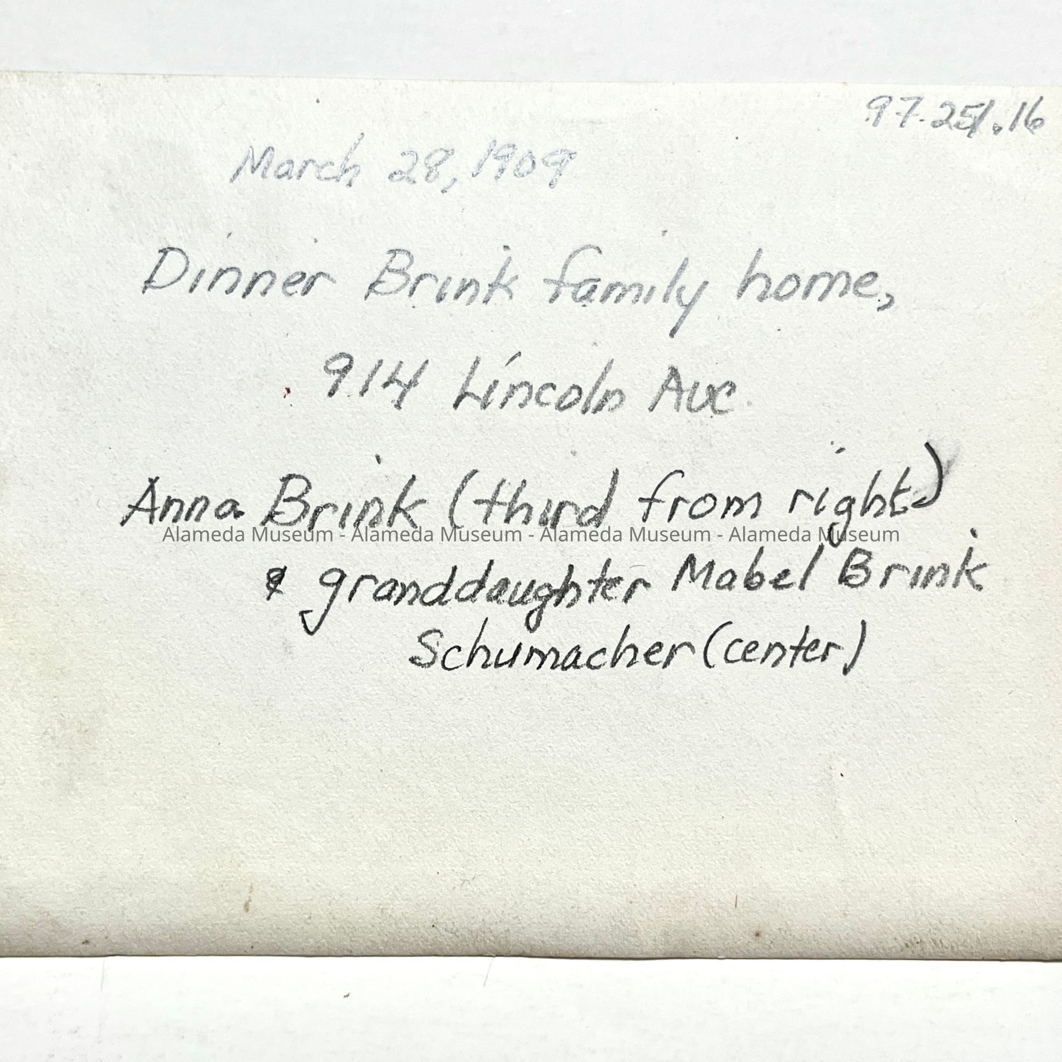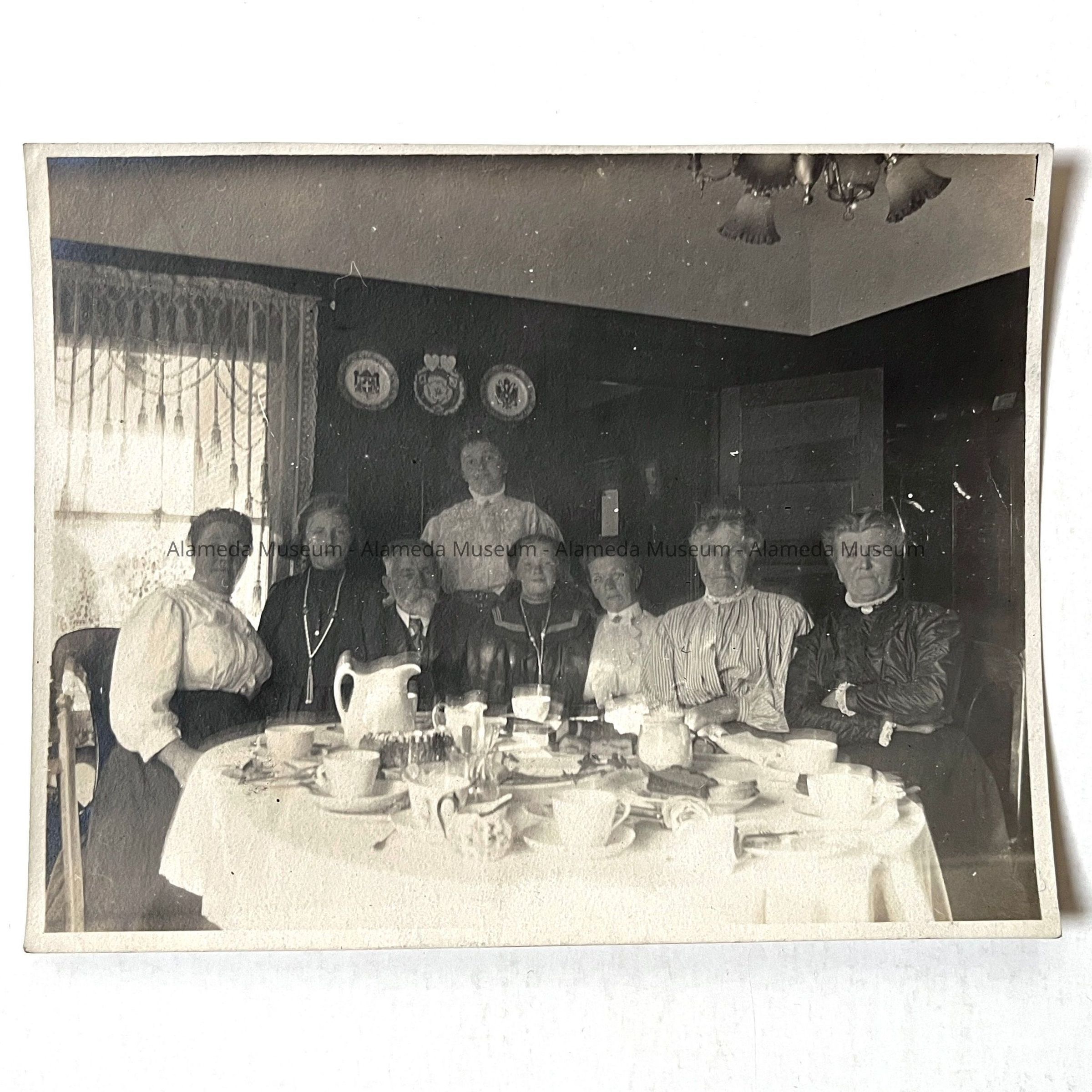 A PHOTOGRAPH OF A LUNCHEON AT THE BRINK FAMILY RESIDENCE, 914 LINCOLN AVENUE, ALAMEDA. MRS ANNA BRINK, THIRD FROM THE RIGHT, AND GRANDDAUGHTER MABEL BRINK SCHUMACHER, CENTER.