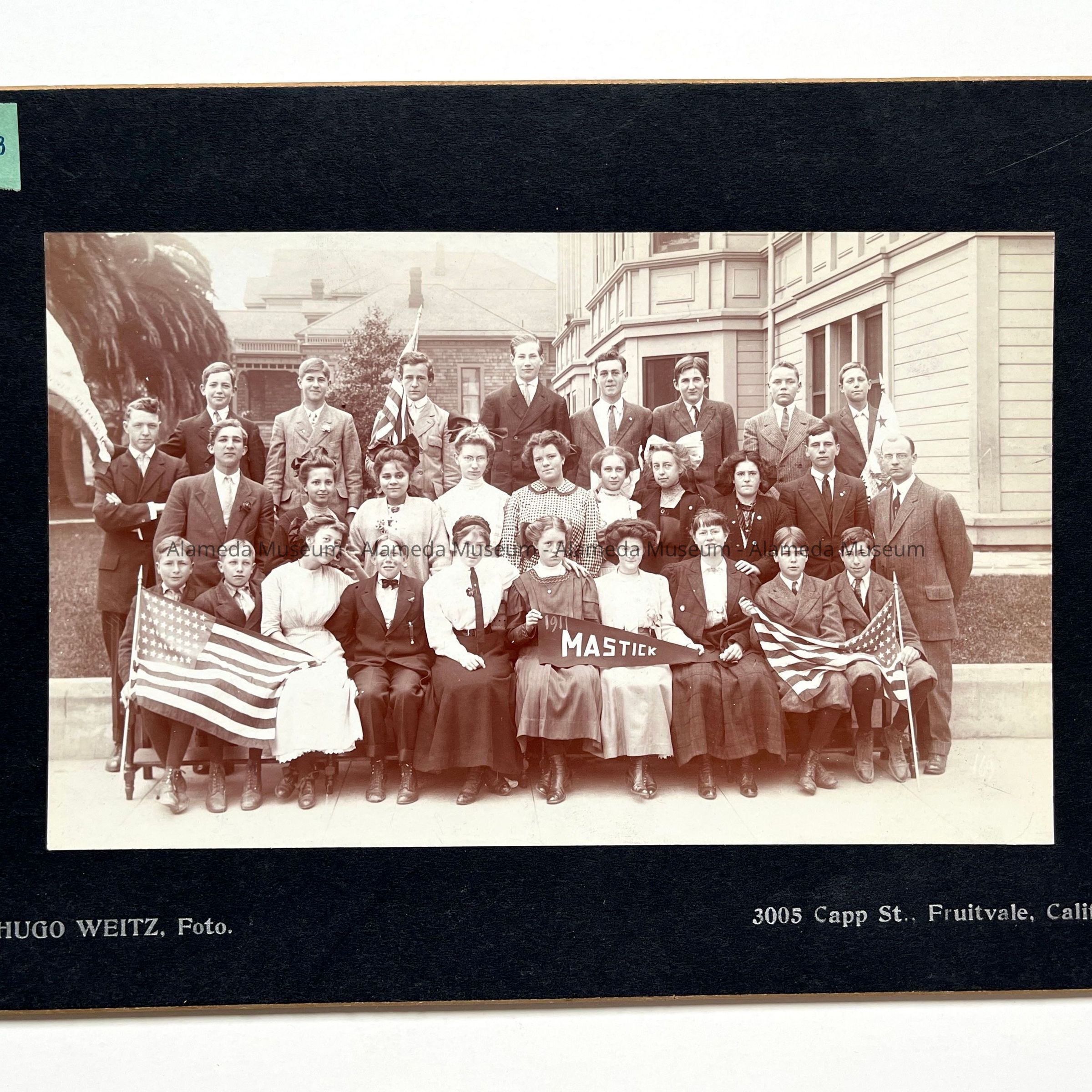 Description: Sepia-toned albumen print photo mounted on charcoal paper board. Photographer: Hugo Weitz, Fruitvale, CA (as imprinted in silver on the mounting). An old green cataloging label is glued to the upper left corner of the mounting.