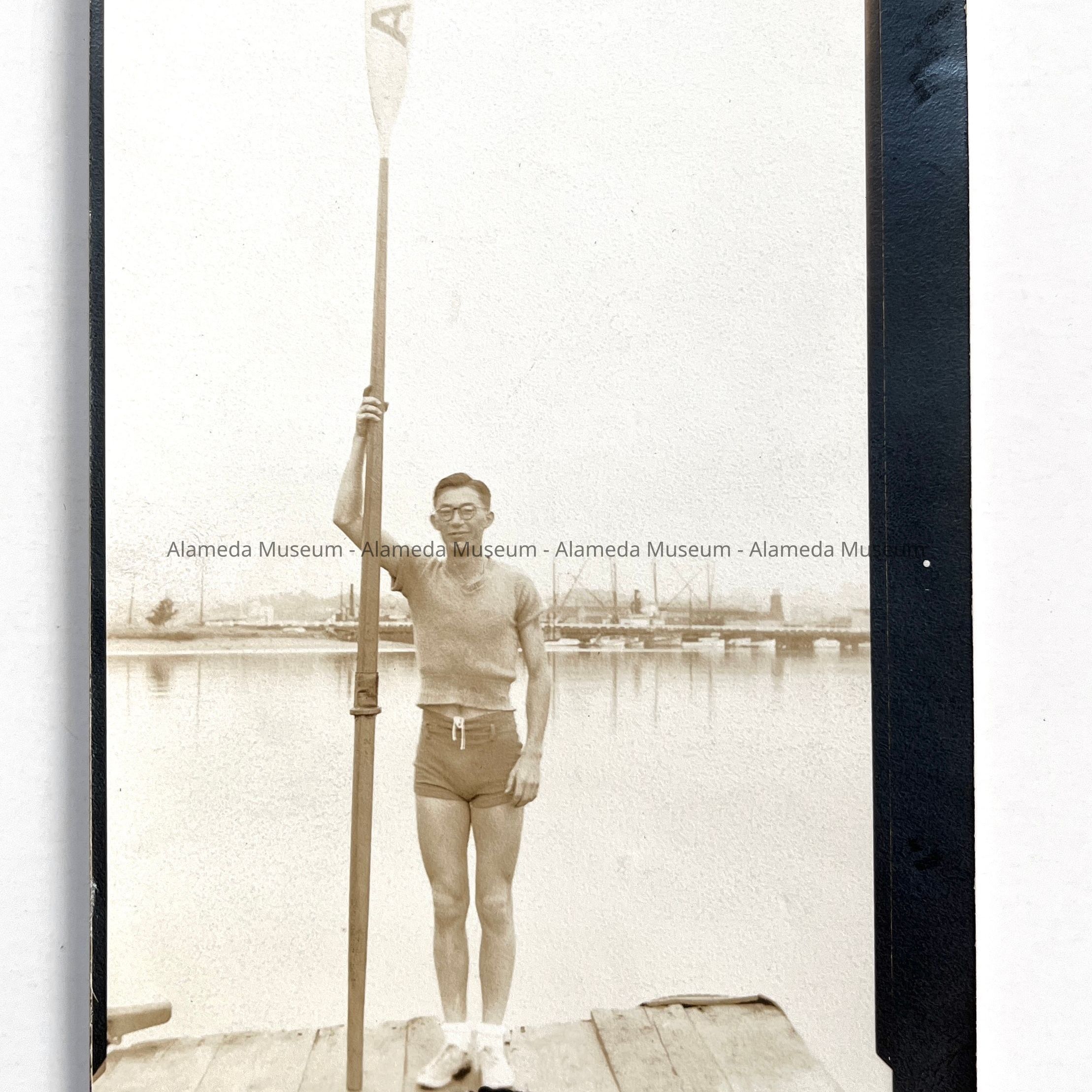 INDIVIDUAL MEMBER --- WHO APPEARS TO BE A JAPANESE AMERICAN --- OF THE ALAMEDA BOATING CLUB. HE IS POSED WITH AN OAR AND THE LETTER "A" ON THE BLADE.