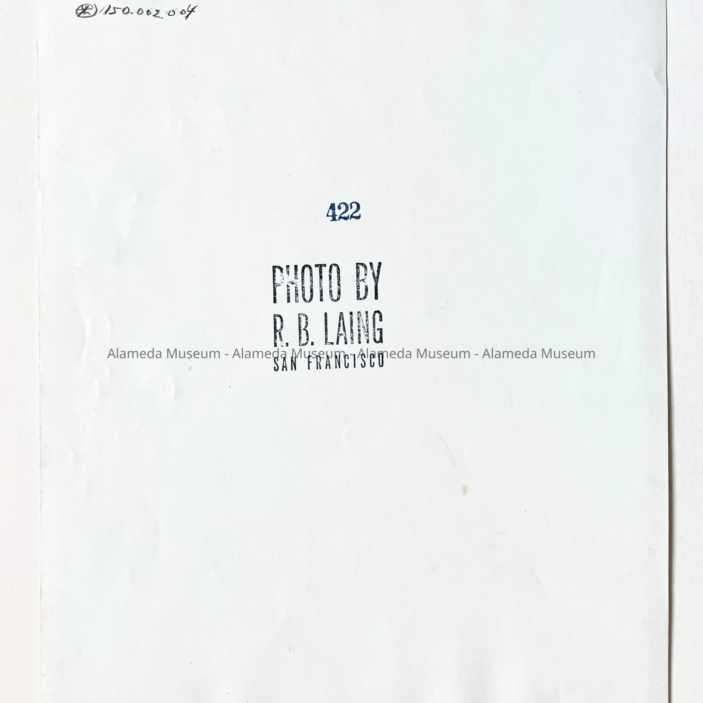 DESCRIPTION: A GLOSSY BLACK AND WHITE PHOTOGRAPH, SIGNED ON THE REVERSE SIDE, "PHOTO BY RB LAING, SF, 1820."