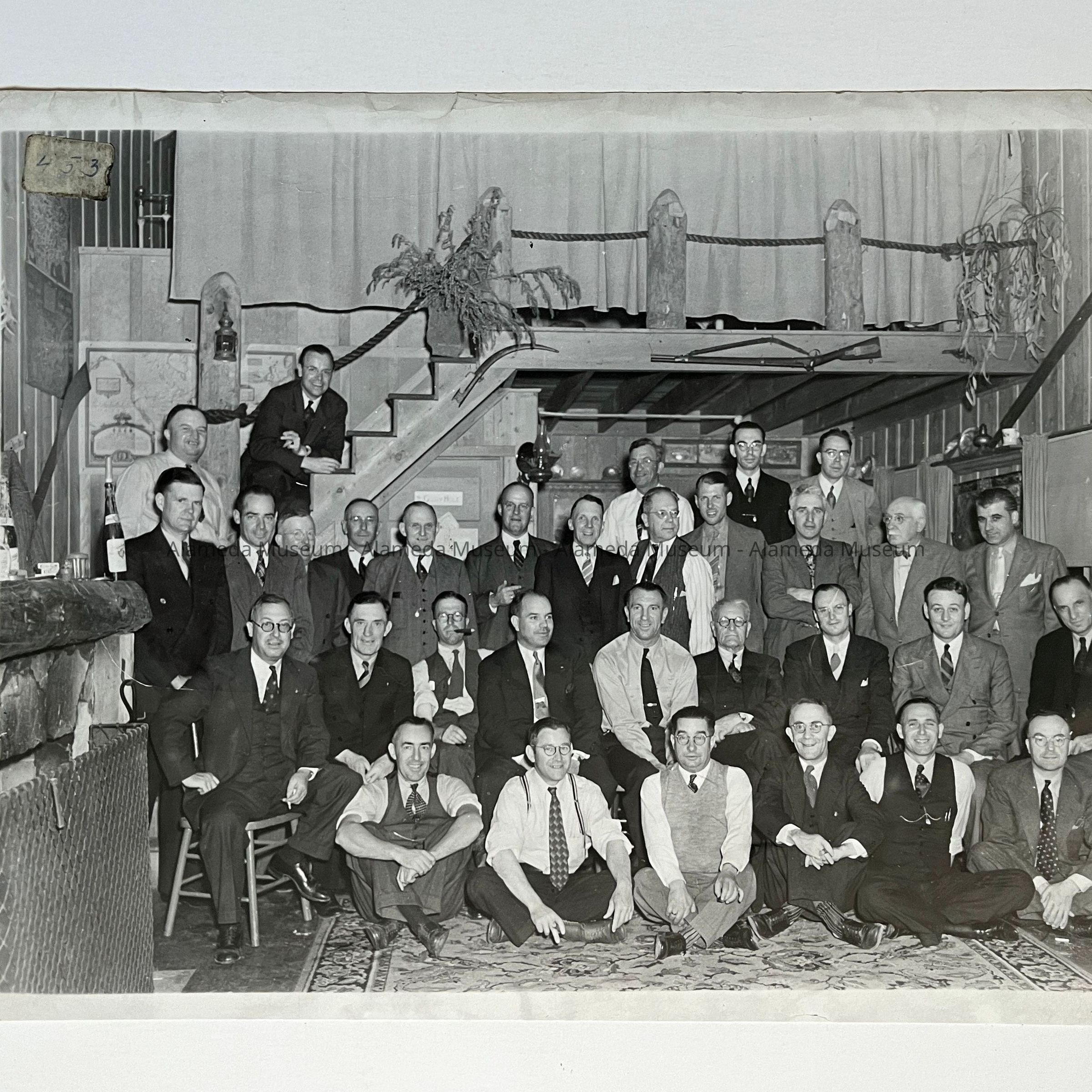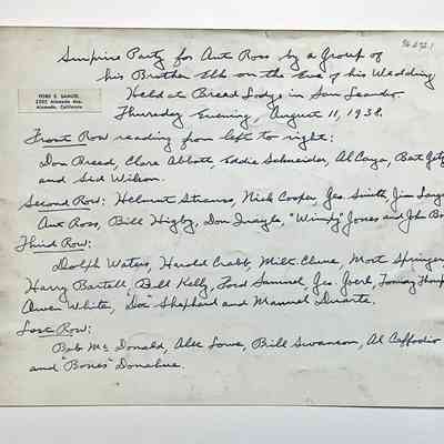 History of Object: Scene from a surprise birthday party for Aut Ross by a group of his fellow Elks on the eve of his wedding. The affair was held at Breed Lodge, San Leandro, Aug. 11, 1938.