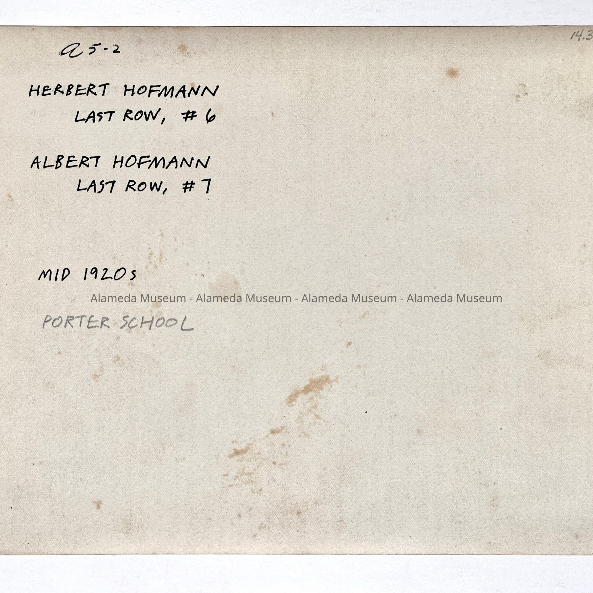 A PHOTO OF AN UNIDENTIFIED GRADE STUDENTS ASSEMBLED AT THE FRONT DOOR ENTRANCE OF PORTER SCHOOL, IN THE MID-1920's. INCLUDED ARE HERBERT AND ALBERT HOFMANN, SONS OF GEORGE JULIUS HOFMANN.