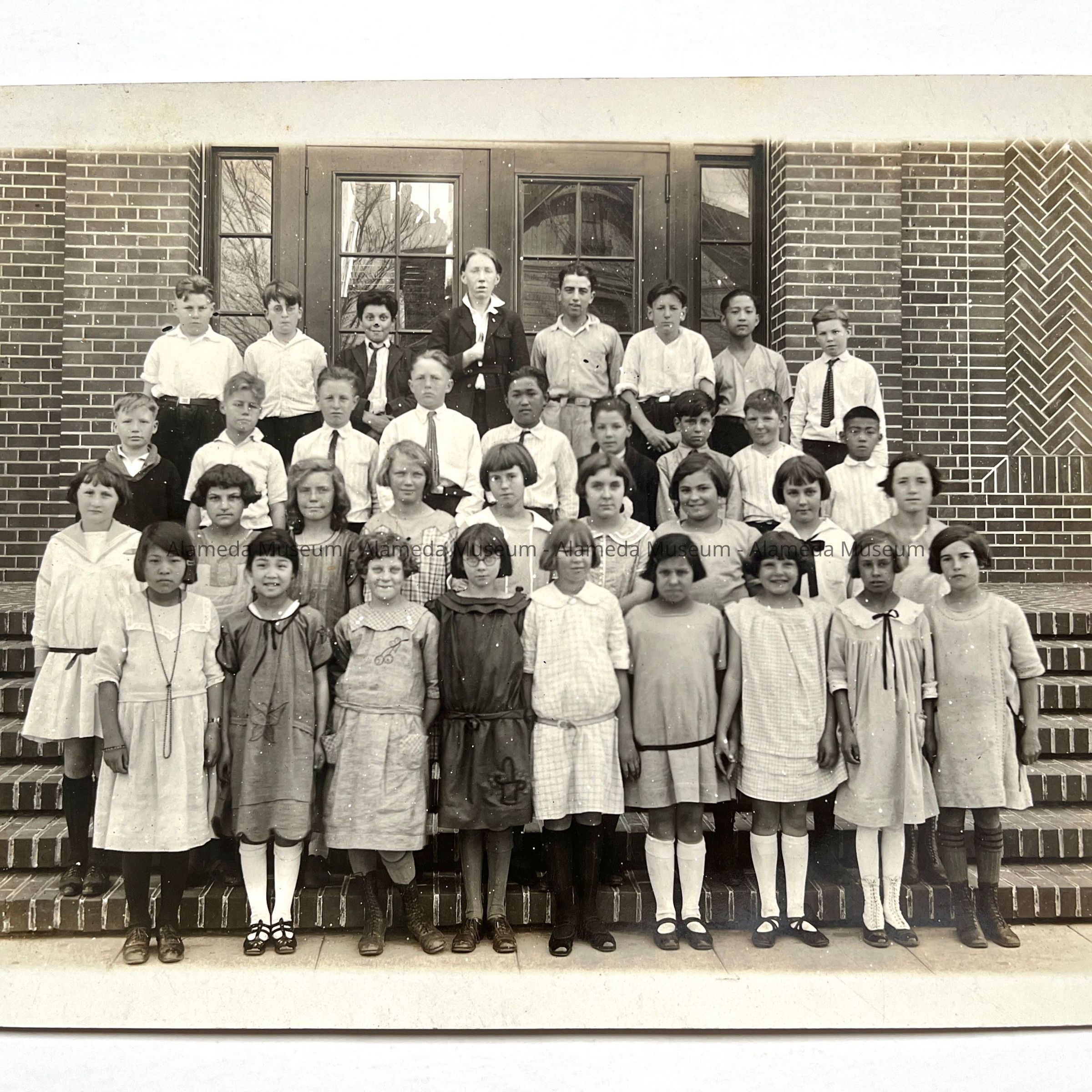 PHOTOGRAPH OF AN UNIDENTIFIED CLASS STANDING ON THE STEPS OF THE MAIN ENTRANCE TO PORTER SCHOOL, ALAMEDA, CA. CIRCA 1930.
