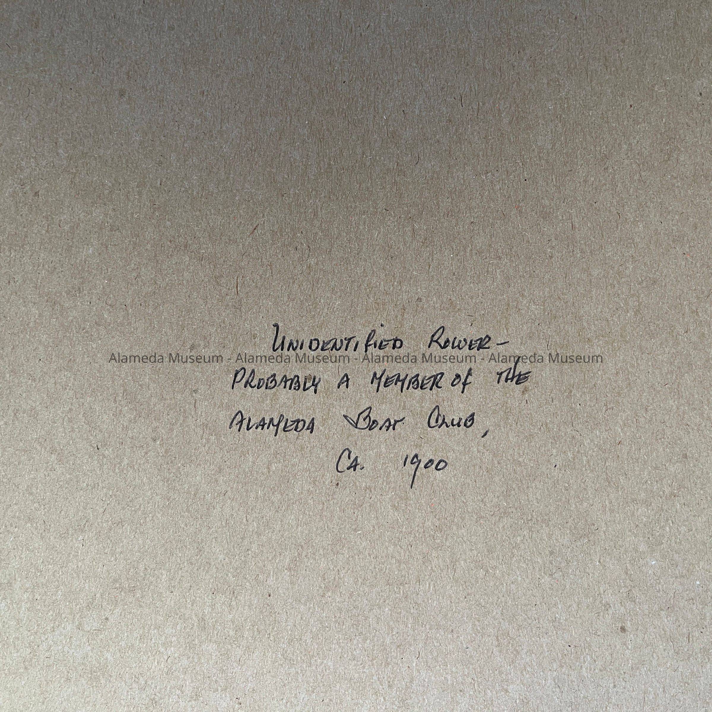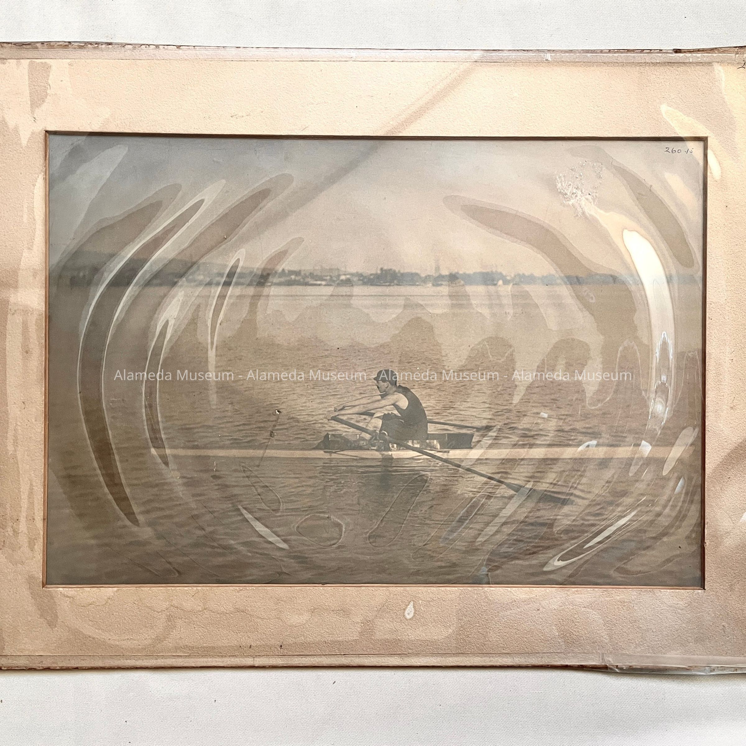 History of Object: Unidentified rower in a racing shell, practicing in what is probably the Oakland-Alameda Estuary. He was possibly a member of the then-popular Alameda Boat Club.