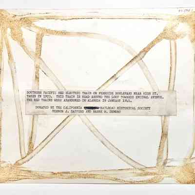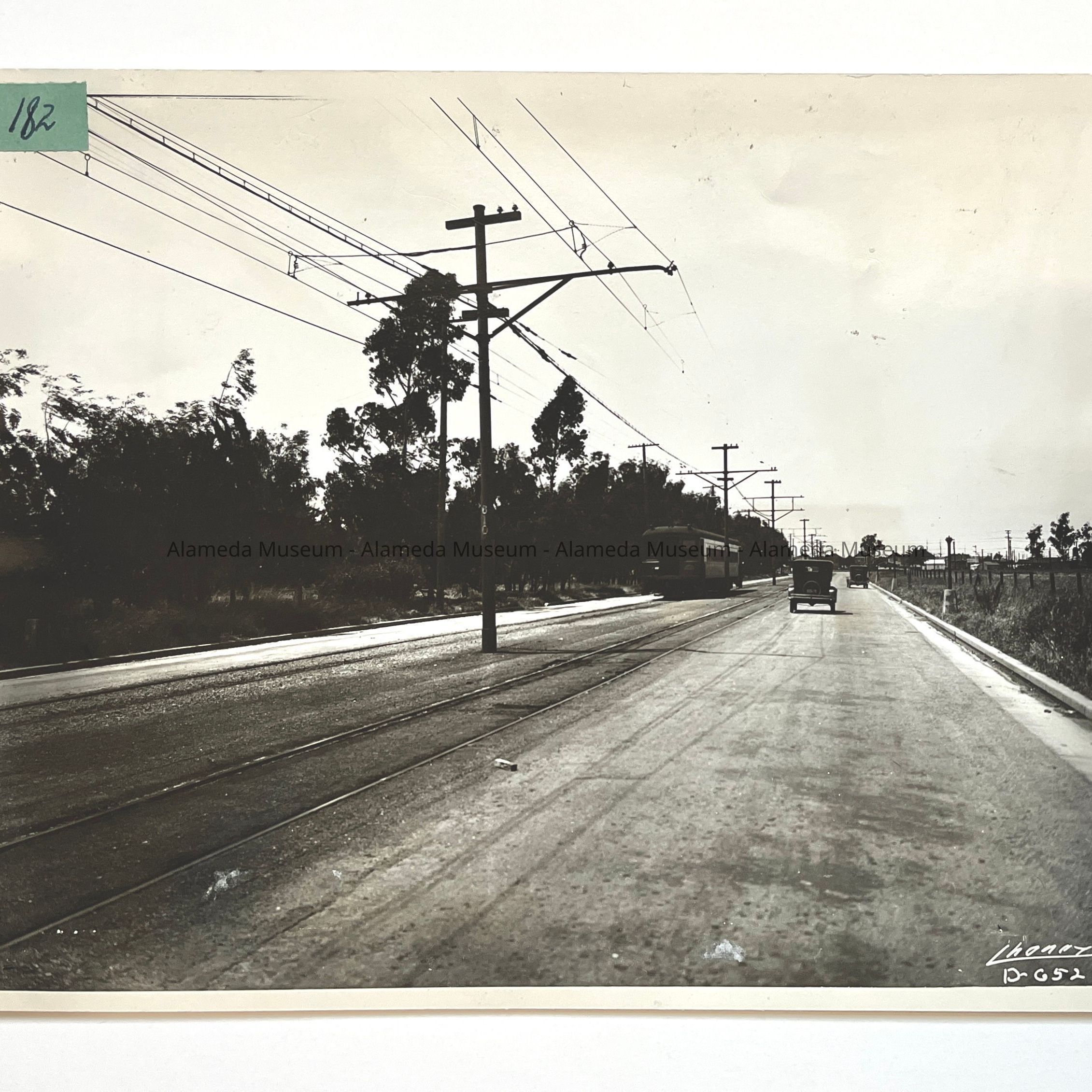 History of Object: So. Pacific red electric train at Fernside Blvd. near High St. The "red trains" were abandoned in Alameda in January, 1941.
