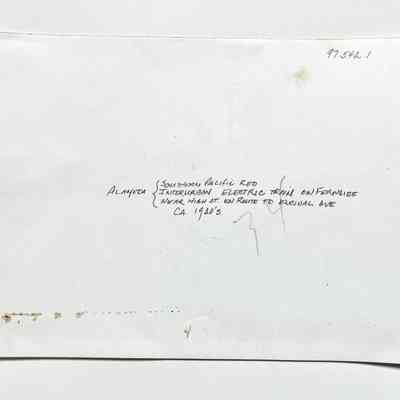 History of Object: Distant view of a S.P. red electric train on Fernside Blvd. near High Street, with a couple of old automobiles nearby.