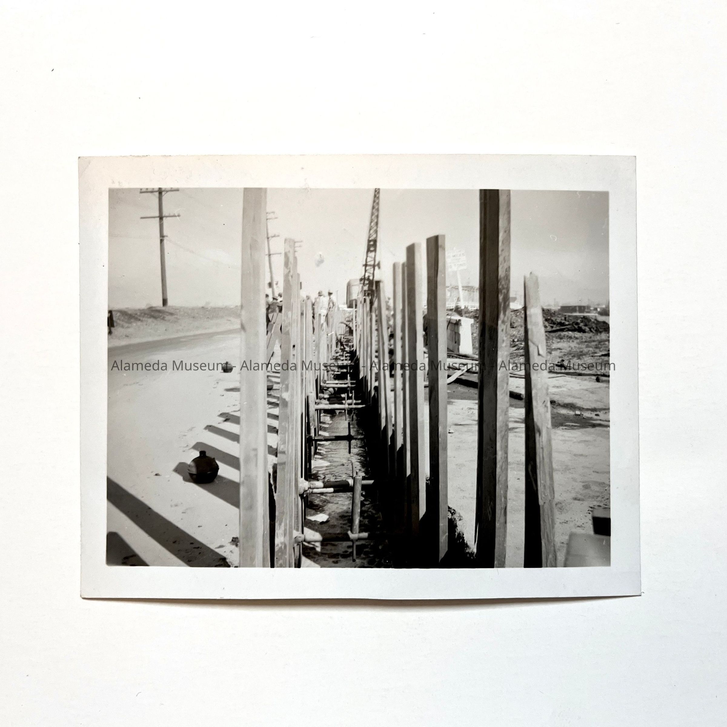 History of Object: Construction of a sewer line on Maitland Drive (now Island Drive), approaching the old Bay Farm Island Bridge across Doolittle Drive.