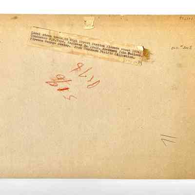 Photographer unknown. The image has thumbtack holes in all corners and a dark brownish glue staining on its upper right corner. The mounting has an old white label below the full length of the image, imprinted with descriptive material.