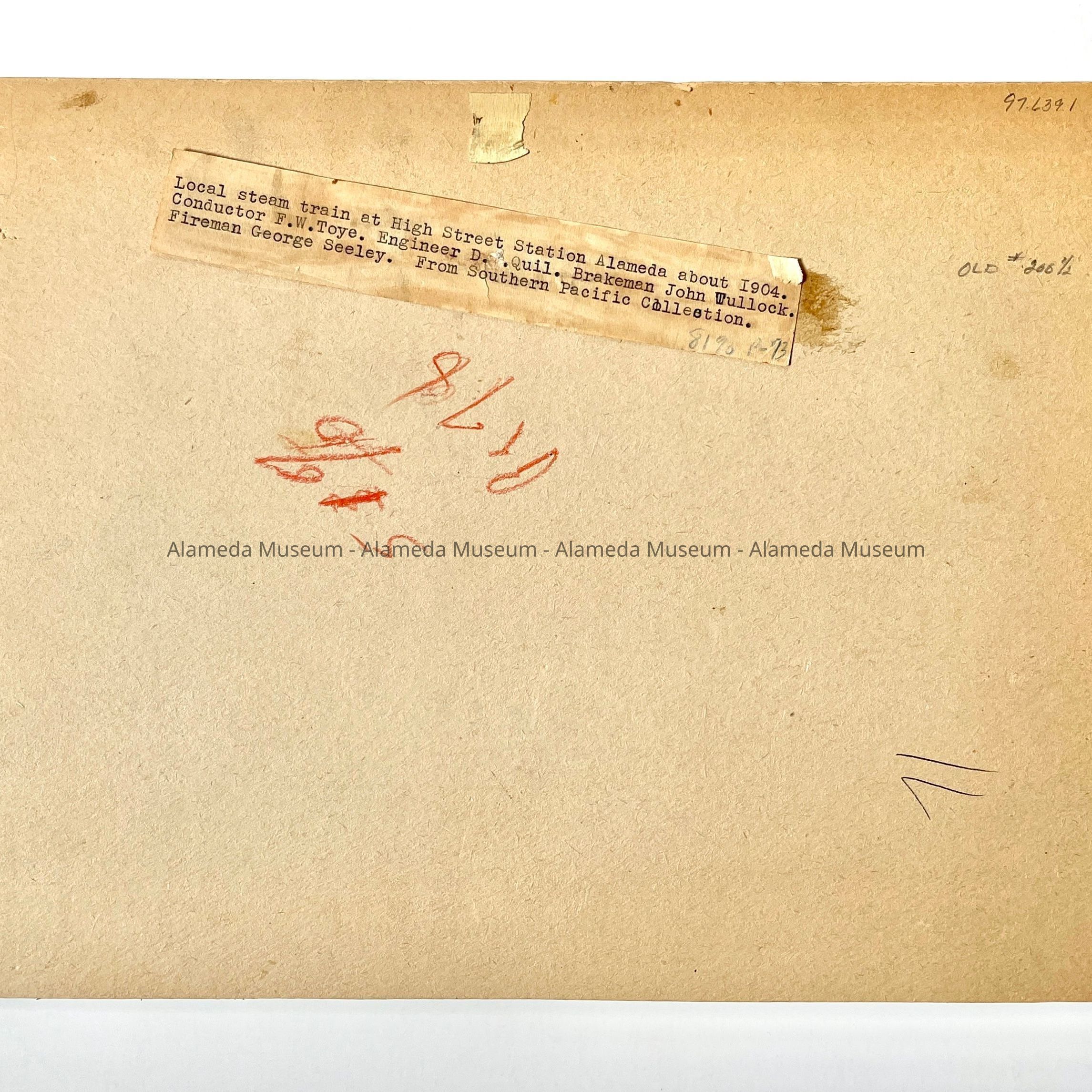 Posed beside the locomotive are Fred Toye - conductor; Dan Quill- engineer; John Trellock - brakeman; and George Seeley - fireman. The original image is in the Southern Pacific Collection.