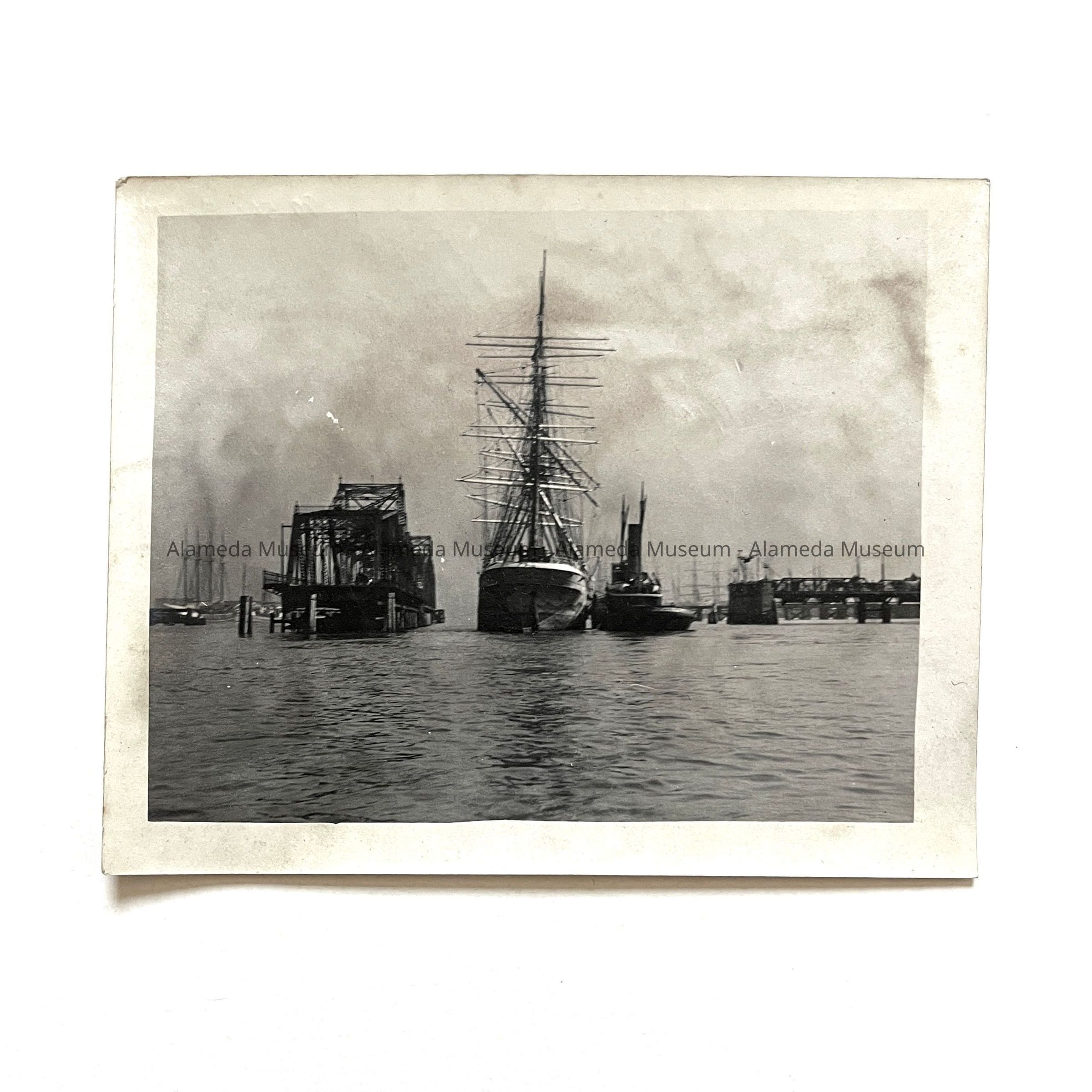 History of Object: View of a tall masted vessel (possibly part of the Alaska Packers fleet) passing through the channel by the opened Webster Street Bridge.