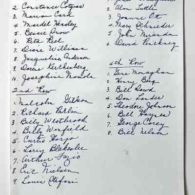 PHOTOGRAPH OF AN UNIDENTIFIED GRADE- LEVEL CLASS, WASHINGTON SCHOOL, SPRING 1944. ON THE REVERSE SIDE IS A LISTING OF NAMES OF STUDENTS PICTURED.