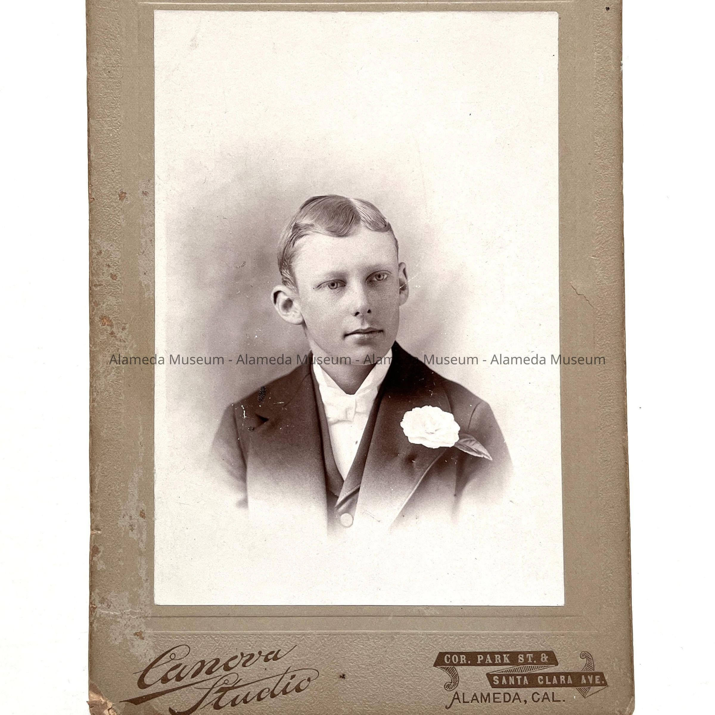 History of Object: A head and shoulders photo of an unknown young man. Photographed by Canova Studio, corner of Park St. and Santa Clara Ave.