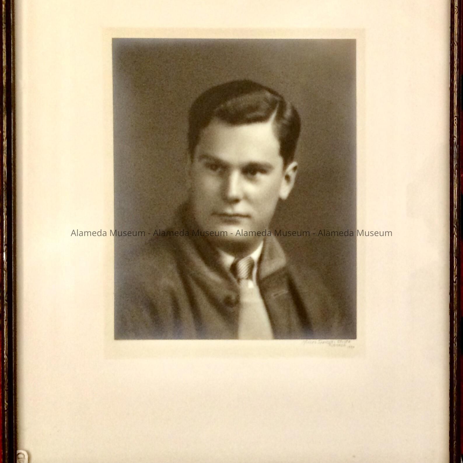 History: Photograph of an unidentified young man, possibly a high school graduation photograph taken by the prolific female photographers, the Misses Spencer and Stolte, who were in business in Alameda from 1913 to 1955. The photograph subject was a friend of Joseph & Alice Durein, from whose estate the picture was purchased.