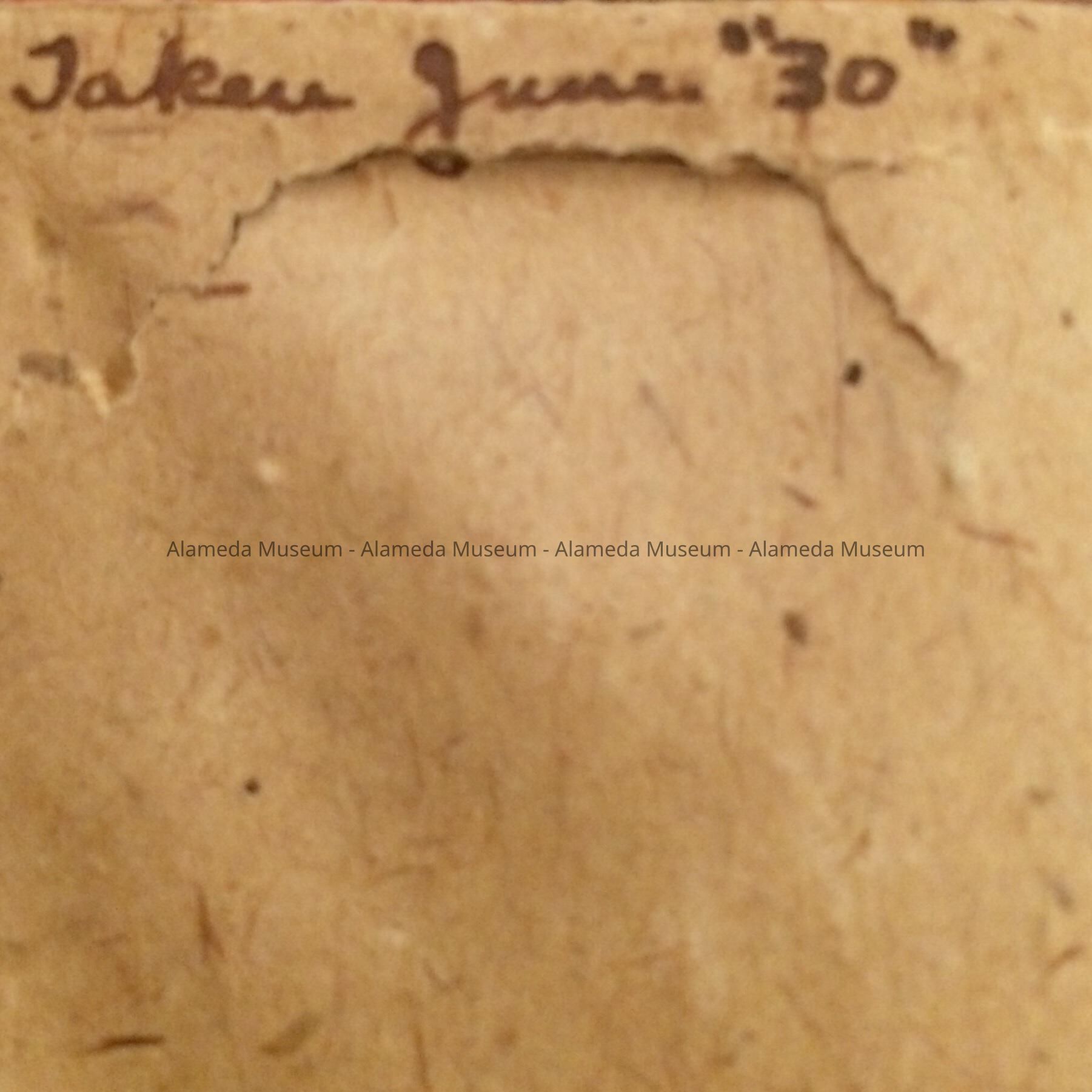 Description: Black and white photograph, surrounded by off-white mounting. Signature below the photograph on mounting in pencil states “Misses Spencer and Stolte, Alameda, 1930”. In original gesso frame of gray accentuated with silver.