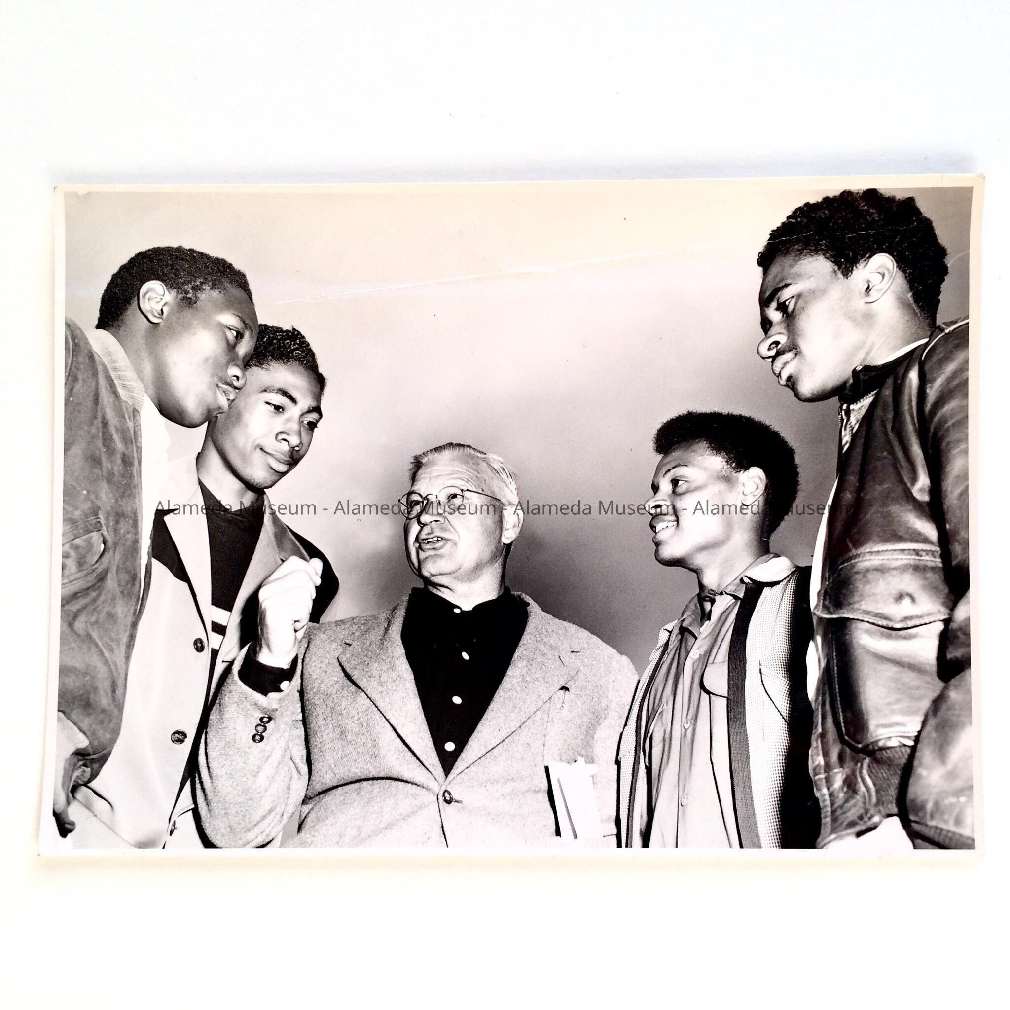 A PHOTOGRAPH OF ALAMEDA HIGH SCHOOL COACH --- LEWIS C JOLLEY (CENTER OF PHOTO) --- AND FOUR AFRICAN-AMERICAN ATHLETES.