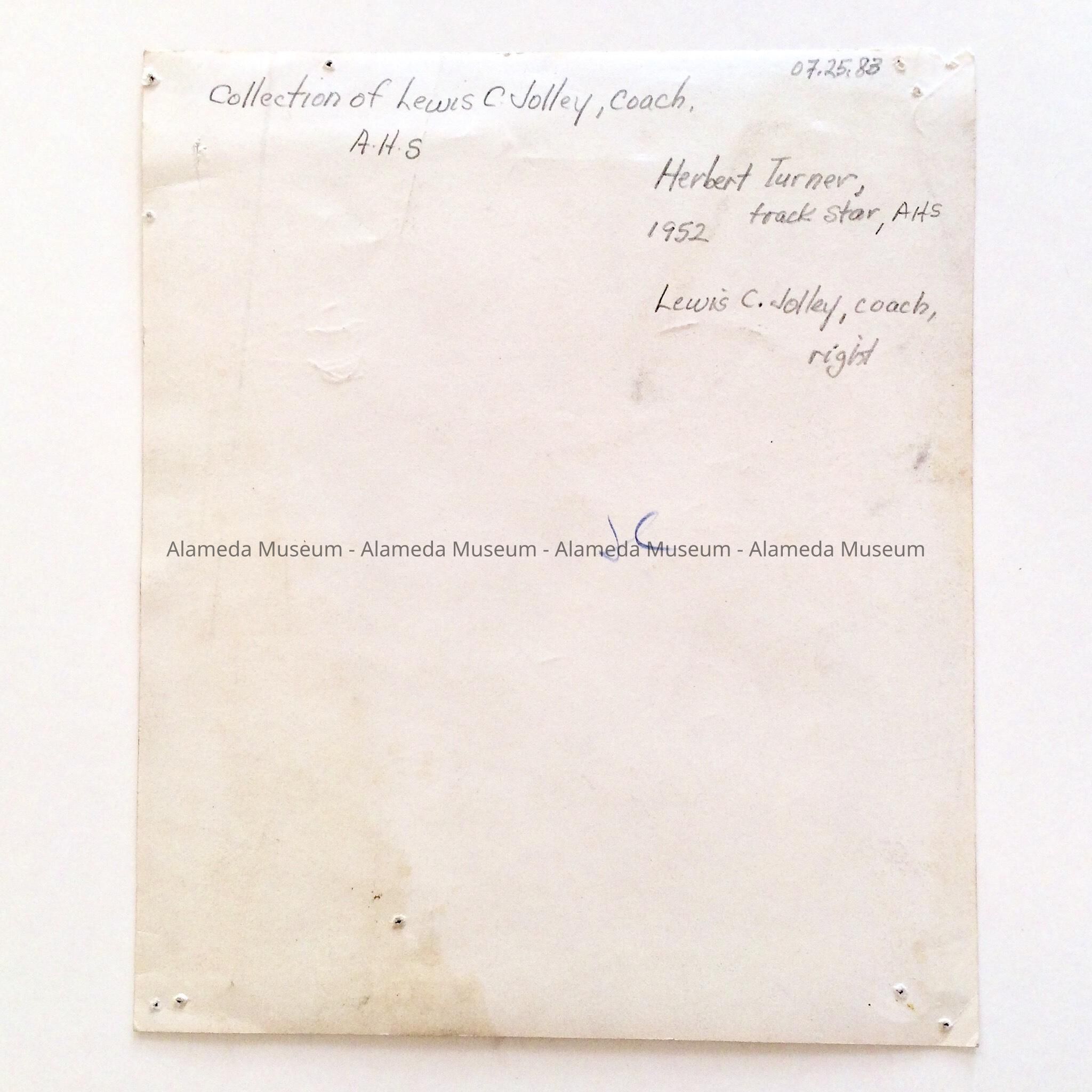 A PHOTO OF THE STAR ALAMEDA HIGH SCHOOL SPRINTER HERBERT TURNER AND HIS COACH, LEWIS C JOLLEY.