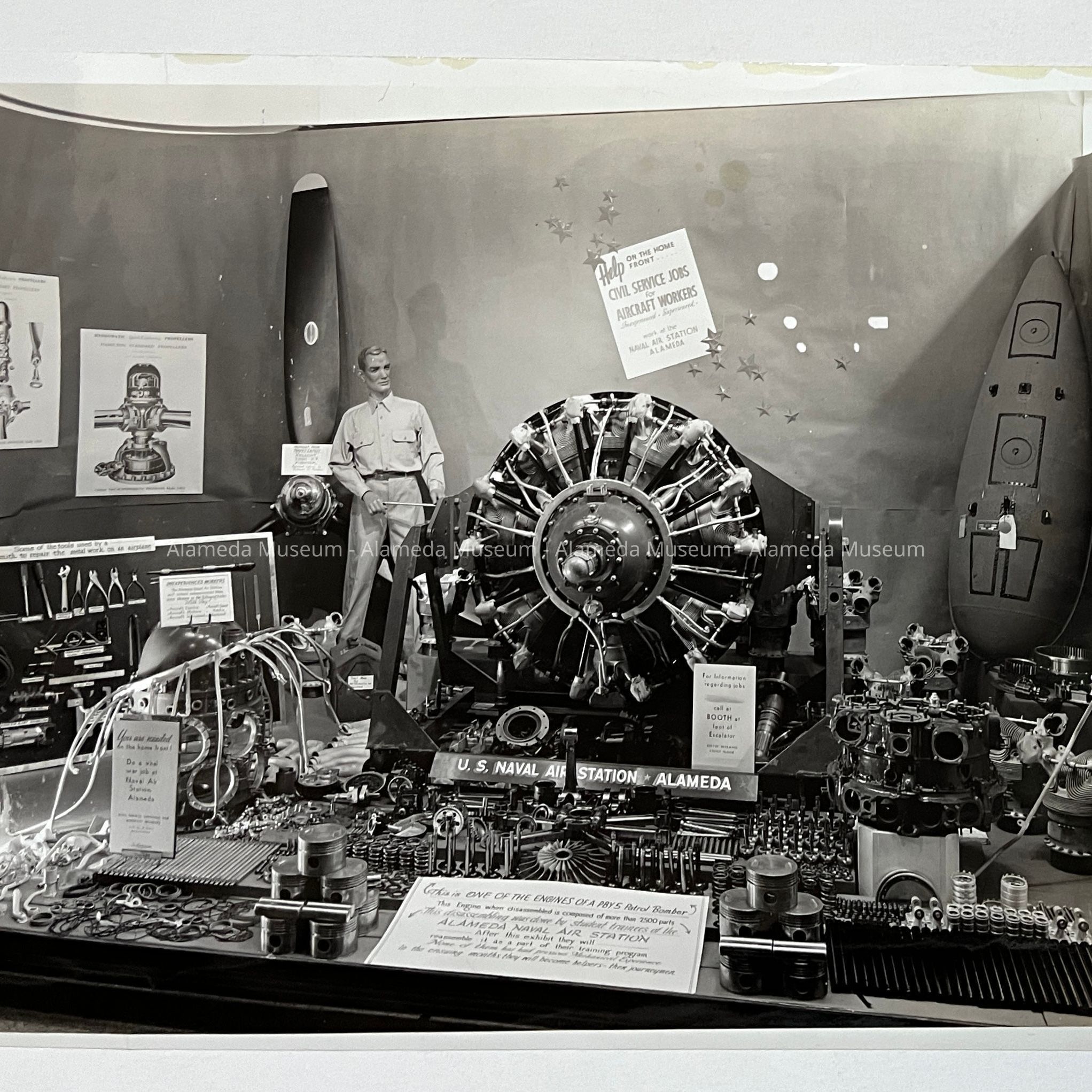 PHOTOGRAPH DEPICTING A DISPLAY OF AIRPLANE ENGINE AND PARTS, WITH THE CAPTION, "U S NAVAL AIR STATION, ALAMEDA."