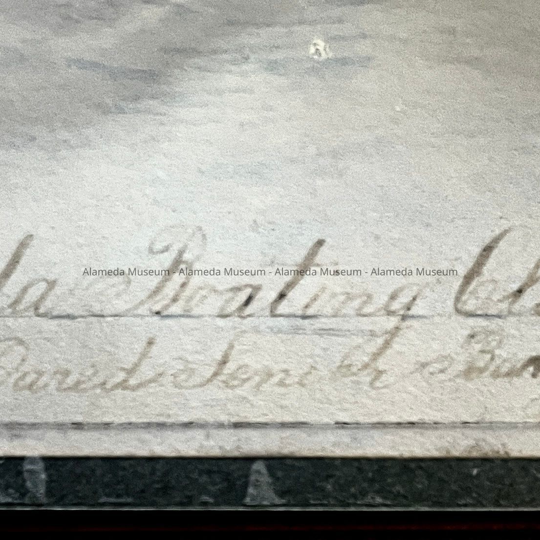Description: Black/white soft focus image, mounted on grey paperboard. Photographer unknown. The image has descriptive and cataloging notations in brown and blue ink upon it. Also, there is some fading along both the left and right margins. The image is inserted into a protective case with a transparent plastic front and lt. tan paperboard backing.