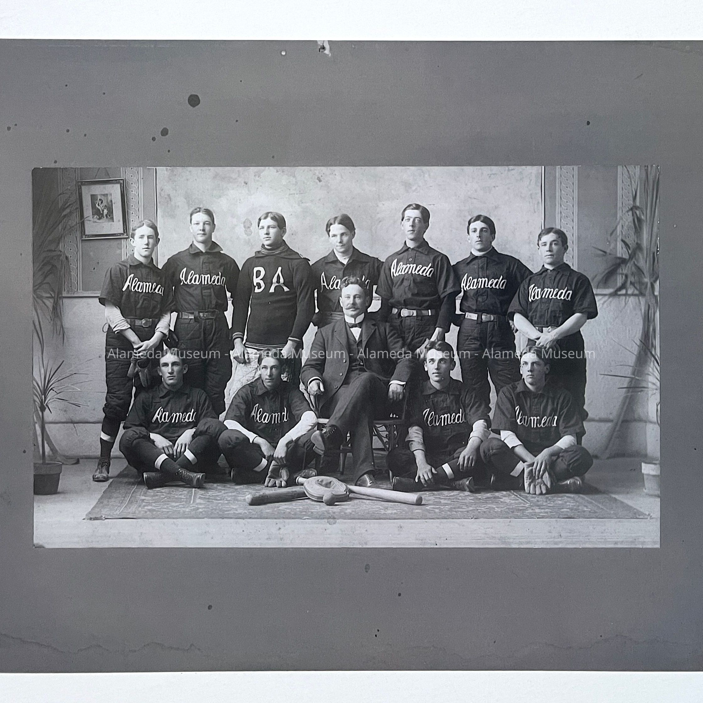 History of Object: Group photo of the Alameda High School baseball team posed inside a photographer's studio.
