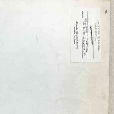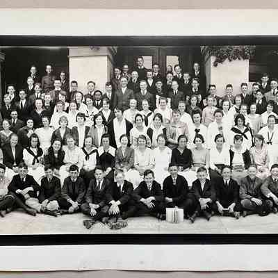 History of Object: Photograph taken May 21, 1918 of the projected Class of 1921, Alameda High School, George C. Thompson, principal. Principal can be seen in the distance, surrounded by the students, standing before the doors of the main entrance of the original Alameda High School at Central Avenue and Walnut Street.