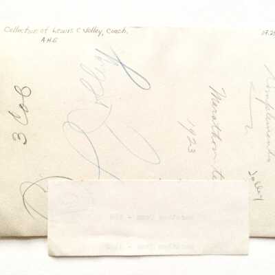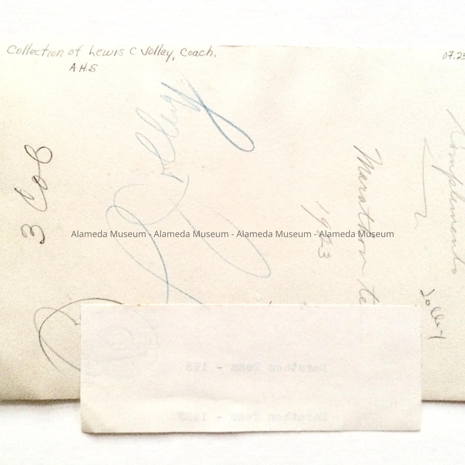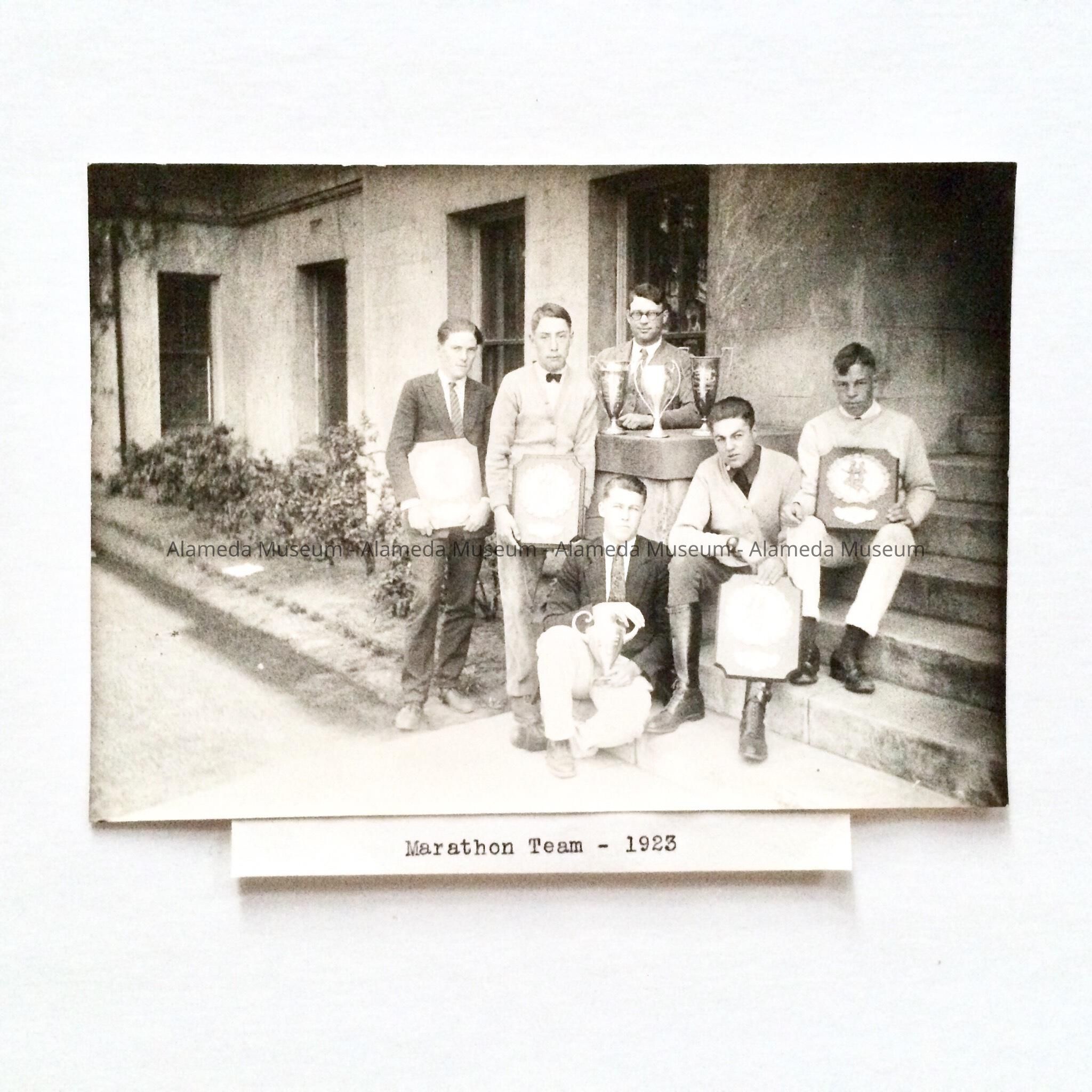 A PHOTO OF THE MARATHON TEAM OF 1923, ALAMEDA HIGH SCHOOL, POSED WITH THEIR TROPHIES AND THEIR COACH, LEWIS C JOLLEY.
